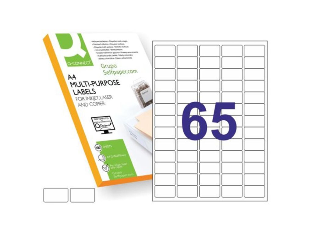 Univerzálne samolepiace etikety pre laserové a atramentové tlačiarne a kopírovacie zariadenia. Formát A4. Farba biela. Balenie 100 hárkov. Etikety na hárku 65 ks.