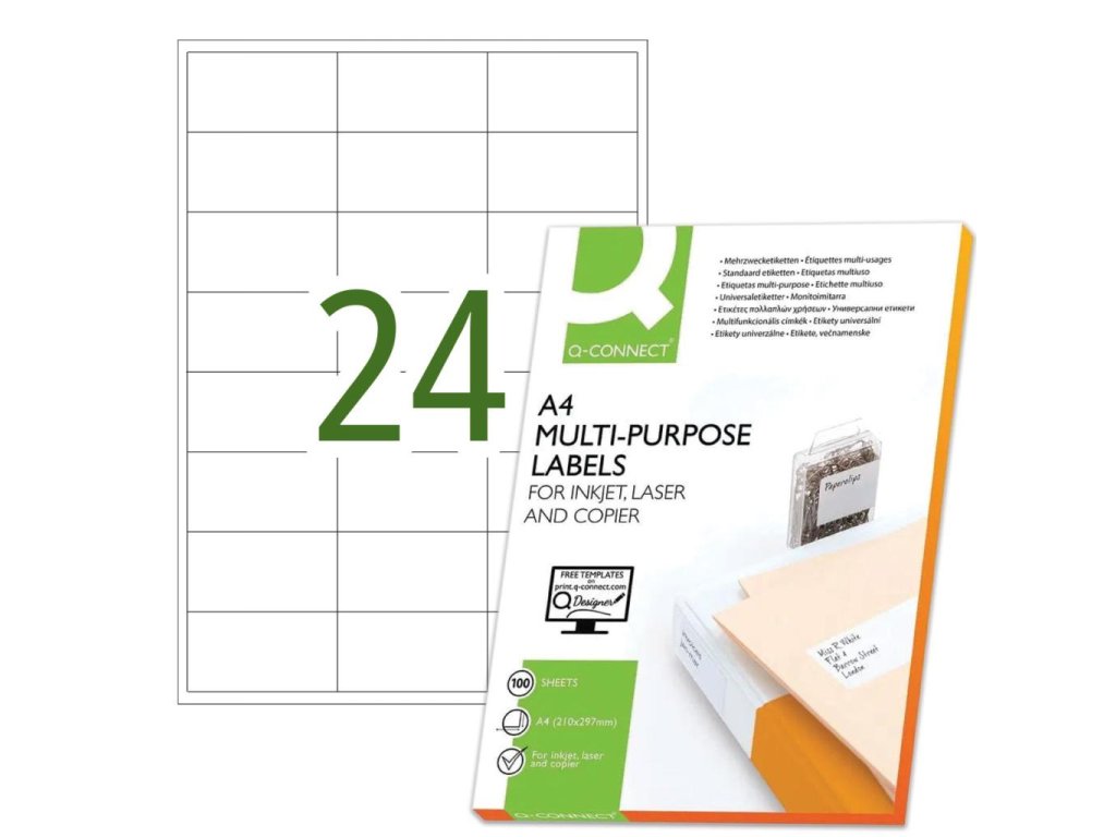 Univerzálne samolepiace etikety pre laserové a atramentové tlačiarne a kopírovacie zariadenia. Formát A4. Farba biela. Balenie 100 hárkov. Etikety na hárku 24 ks.