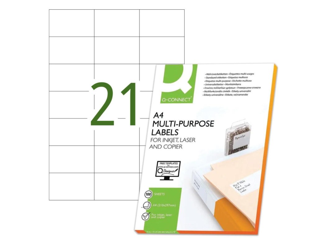 Univerzálne samolepiace etikety pre laserové a atramentové tlačiarne a kopírovacie zariadenia. Formát A4. Farba biela. Balenie 100 hárkov. Etikety na hárku 21 ks.