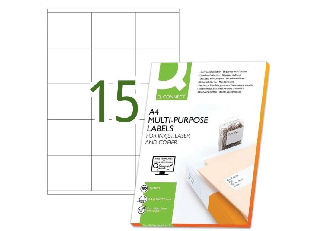 Univerzálne samolepiace etikety pre laserové a atramentové tlačiarne a kopírovacie zariadenia. Formát A4. Farba biela. Balenie 100 hárkov. Etikiet na hárku 15 ks.