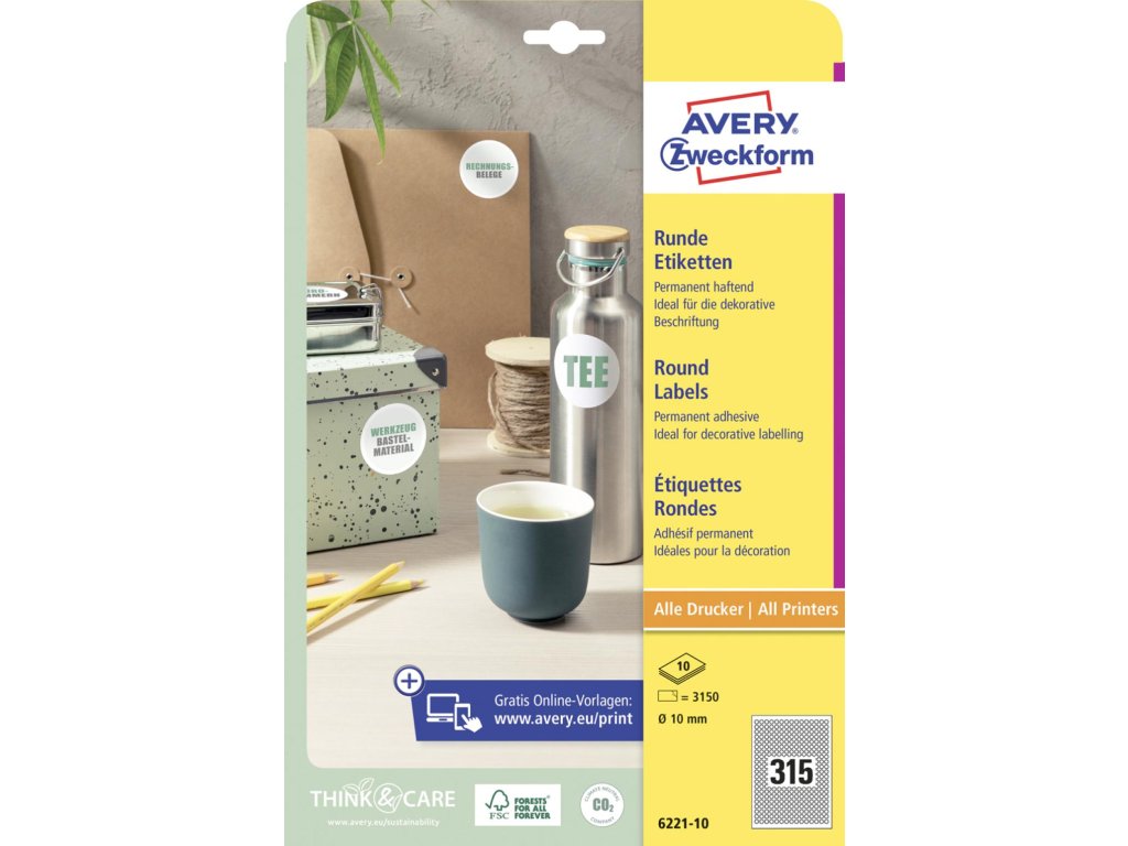 Biele kruhové univerzálne etikety vhodné na každodenné použitie v atramentových a laserových tlačiarňach a kopírovacích strojoch. Ostrá tlač bez bez rozmazávania. Etikety su vyrobené spôsobom šetrným k životnému prostrediu, majú certifikáciu FSCR, sú bielené bez použitia chlóru. Šablóny a softvér pre jednoduchú a rýchlu tlač etikiet k dispozícii zdarma. Formát A4. Balenie 10 hárkov. Priemer 10 mm.