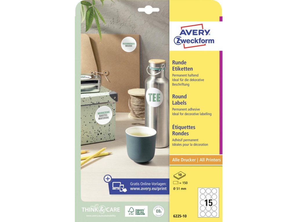 Biele kruhové univerzálne etikety vhodné na každodenné použitie v atramentových a laserových tlačiarňach a kopírovacích strojoch. Ostrá tlač bez bez rozmazávania. Etikety su vyrobené spôsobom šetrným k životnému prostrediu, majú certifikáciu FSCR, sú bielené bez použitia chlóru. Šablóny a softvér pre jednoduchú a rýchlu tlač etikiet k dispozícii zdarma. Formát A4. Balenie 10 hárkov. Priemer 51 mm.