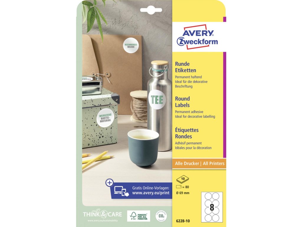 Etikety univerzálne kruhové 69mm Avery A4 10 hárkov