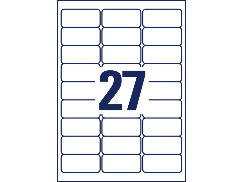 Odnímateľné samolepiace etikety odlepiteľné a znovu prelepiteľné (na bežnom povrchu až 5×) bez toho, aby zanechali stopy lepidla. Sú vhodné pre všetky druhy tlačiarní a kopíriek. Využiteľné najmä na každodenné pracovné činnosti, ako napr. vytváranie popisov, cenoviek, označovanie výrobkov, majetku a pod. Šablóny a softvér pre jednoduchú a rýchlu tlač etikiet k dispozícii zdarma. Rozmery v mm : 63,5 × 29,6. Farba biela. Etikety na hárku 27 ks. Balenie 25+5 hárkov.
