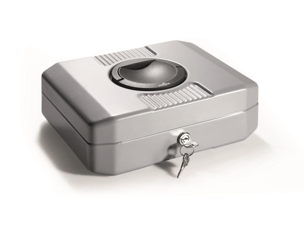 Pokladnička vybavená mincovou priehradkou s ôsmimi oddielmi na eurá a centy v maximálnej hodnote 102,05 Euro. Tri prístupné priehradky na bankovky, priestor na poukážky a stravné lístky v spodnej časti. Sivo-strieborná pokladnička je vyrobená z povrchovo upravenej ocele, všetky vnútorné časti z nárazu vzdorného plastu. Sklápateľné ergonomicky tvarované madlo prispieva k dobrému držaniu, pena na vnútornej strane veka zabraňuje premiešaniu mincí pri prenose, dvojzápadkový zámok zvyšuje bezpečnosť.