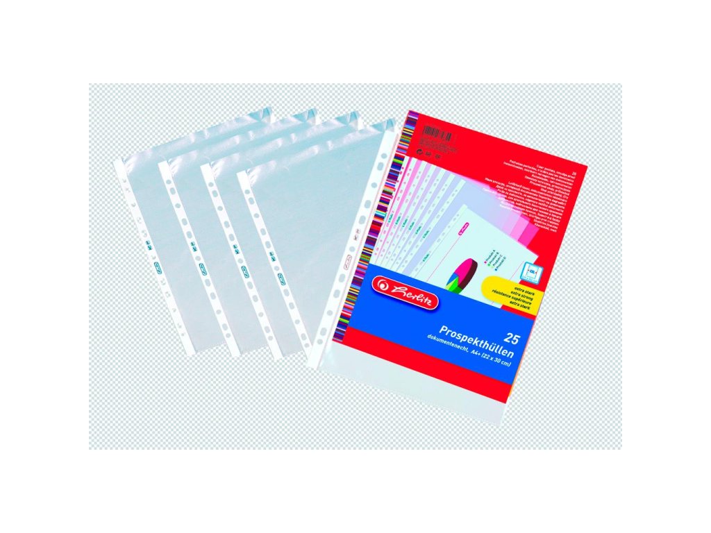 Obaly s eurodierovaním vhodné na zakladanie materiálov rozšíreného formátu A4. Povrch matný. Otvor zhora. Vnútorné rozmery obalu 304 × 220 mm. Balené v sáčku. Hrúbka 100 mic. Balenie 25 ks.