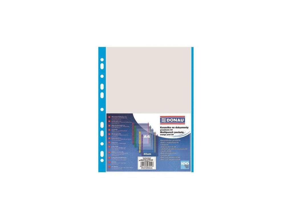 Priehľadné euroobaly z polypropylénu s farebným eurodierovaním a vonkajším farebným prúžkom. Otvor zhora. Formát A4. Povrch zrnitý. 100 ks balené v sáčku.