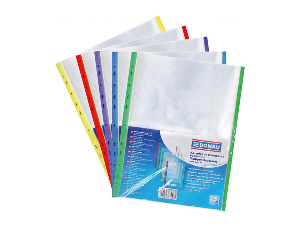 Priehľadné euroobaly z polypropylénu hrúbky 40 mikrónov s farebným eurodierovaním a vonkajším farebným prúžkom. Otvor zhora. Formát A4. Balené po 25 ks v sáčku s prúžkami v jednej farbe bez možnosti výberu farby, zelená, žltá, červená, modrá, fialová.