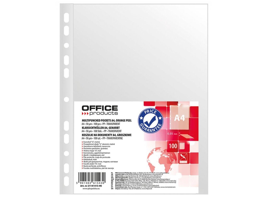 Priehľadný euroobal z polypropylénu. Otvor zhora, eurodierovanie, povrch matný, mierne pórovitý. Formát A4. Balenie 100 ks v sáčku.