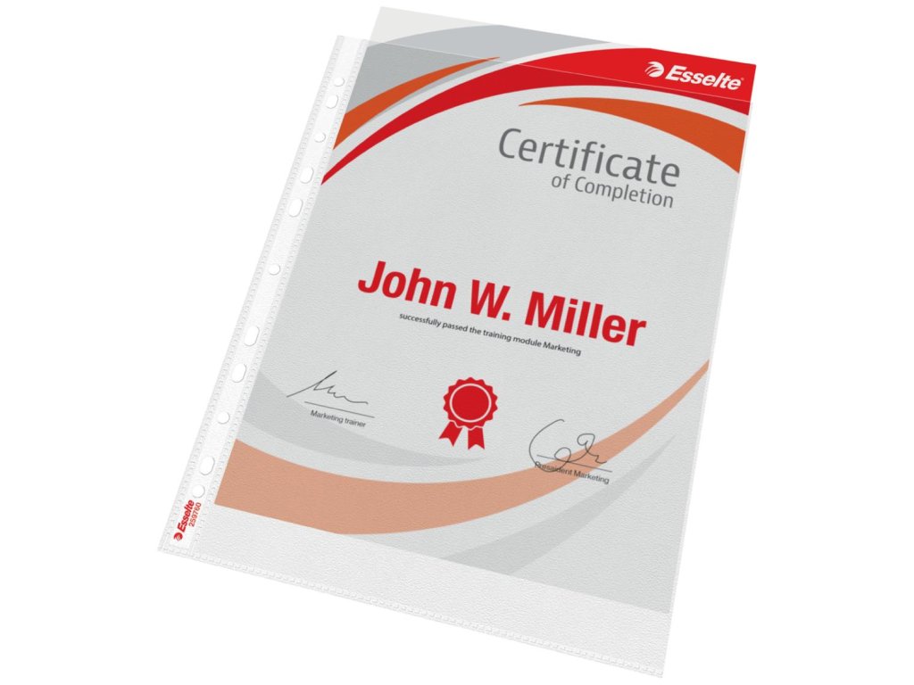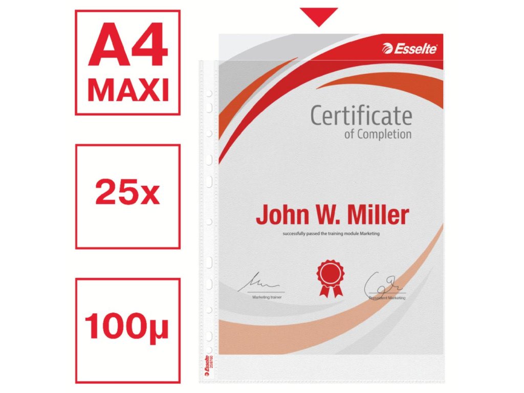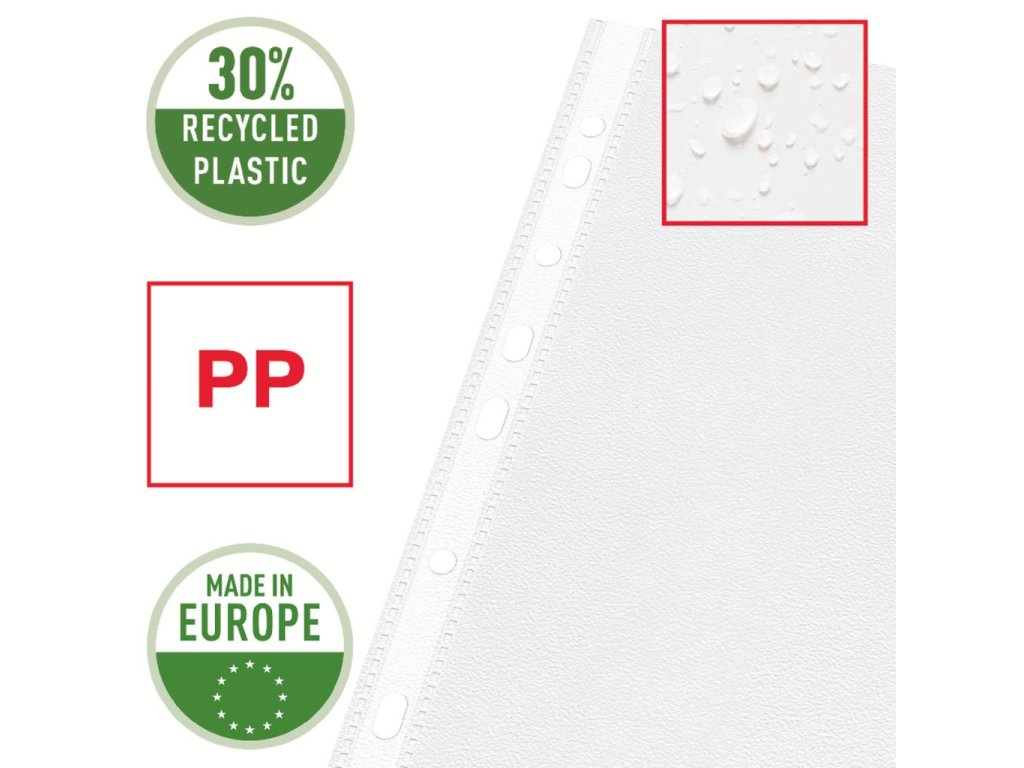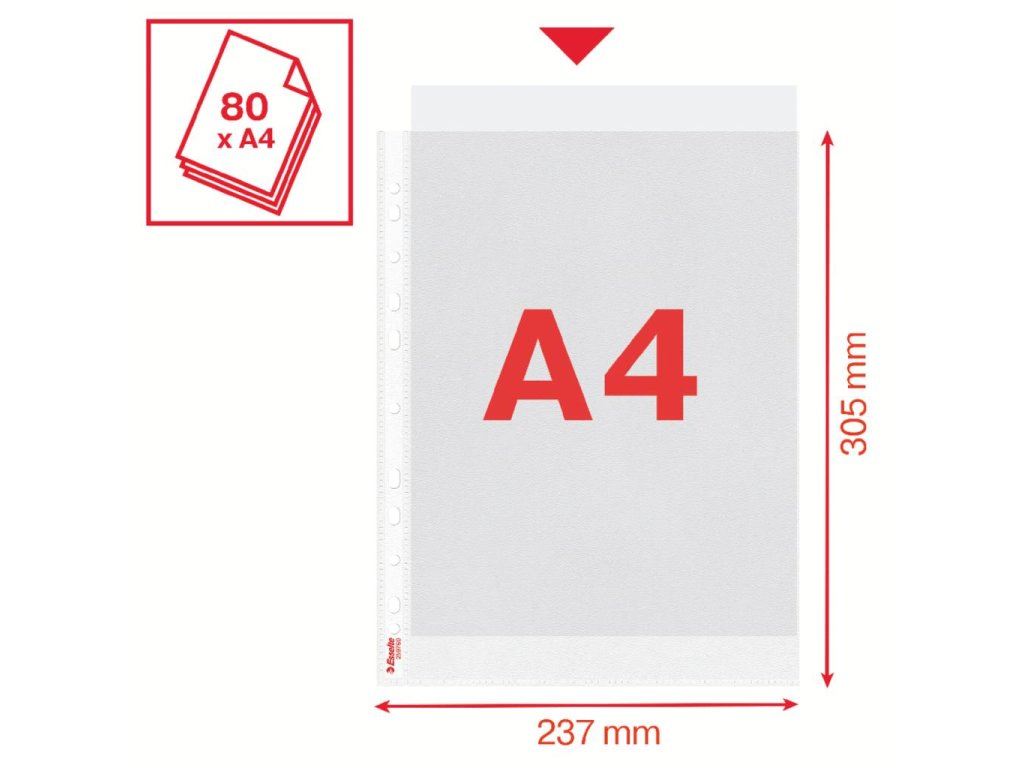 Pevné plastové závesné dosky rozšíreného formátu A4 na väčšiu kapacitu, než majú bežné závesné dosky. Povrch matný, otvor zhora. Hrúbka 100 mic. Vnútorné rozmery obalu 304 × 220 mm. Embosovaná PP fólia hrúbky 0,1 mm. Balenie 25 ks v PE sáčku.