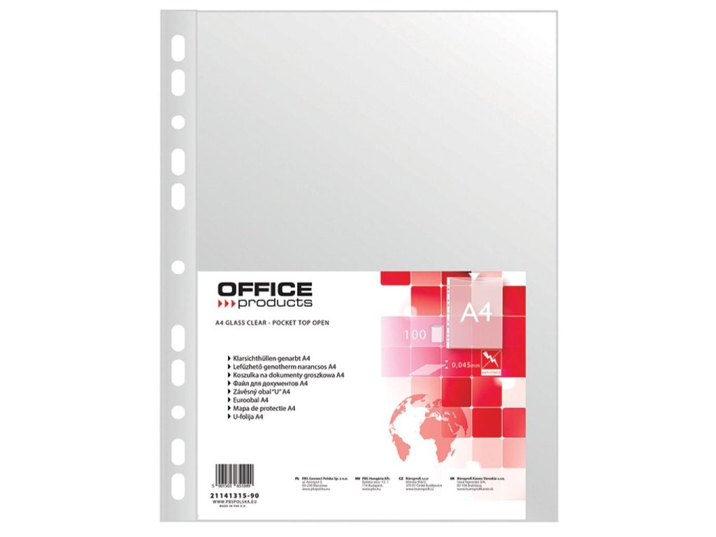 Priehľadný euroobal z polypropylénu. Otvor zhora, eurodierovanie, povrch matný, mierne pórovitý. Formát A4. V kartóne 26 balení. Balenie 100 ks v sáčku.