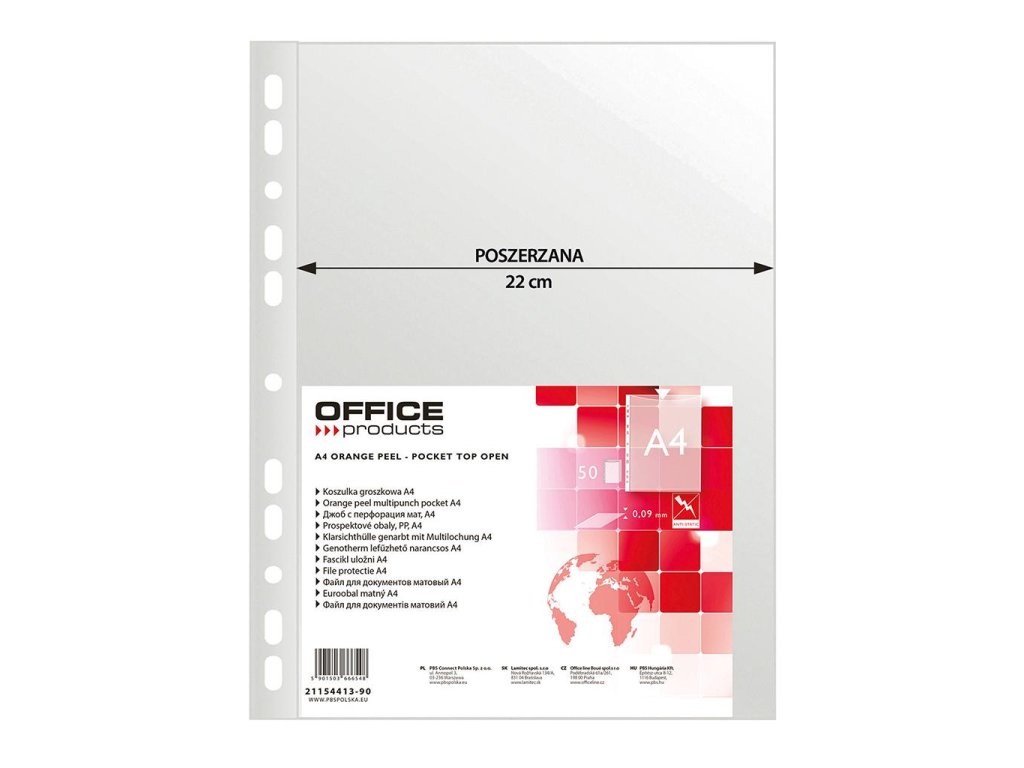 Obaly s eurodierovaním vhodné na zakladanie materiálov rozšíreného formátu A4. Povrch matný. Otvor zhora. Vnútorné rozmery obalu 304 × 220 mm. Balené v sáčku. Hrúbka 90 mic. Balenie 50 ks.
