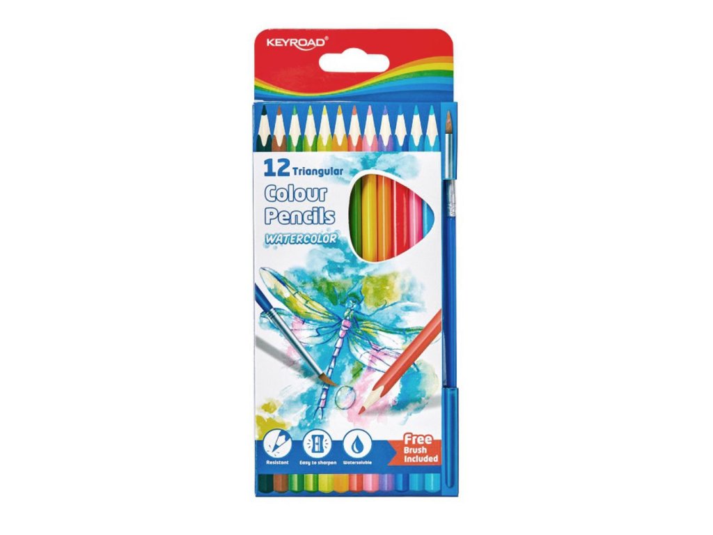 Akvarelové trojuholníkové ceruzky, na suché a mokré kreslenie, akvarel rozpustný vo vode. Odolné a ľahko sa brúsia. S mäkkým, bohato pigmentovaným grafitom, hrúbka: 3,0 mm. V sade 12 ks, plus 1 ks štetec. Farba: mix farieb.