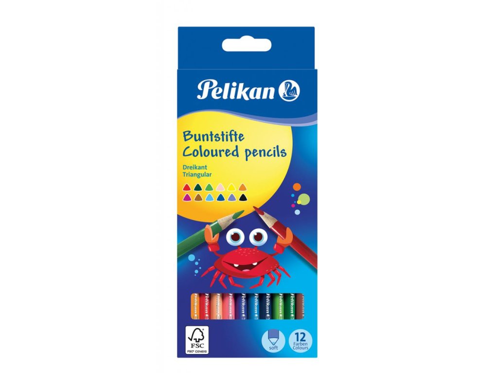 Trojhranné tenké farbičky Pelikan, pevné, lakované, odolné voči zlomeniu. Priemer tuhy 3 mm. Balenie 12 ks.