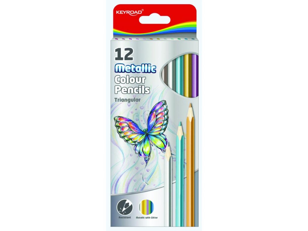 Trojhranné metalické farbičky, ideálne na maľovanie omaľovániek. Mäkký grafit, ľahko strúhateľné. 12 ks, mix metalických farieb.