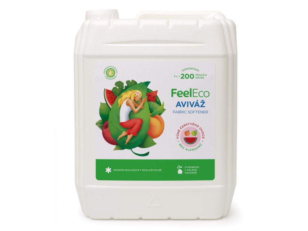 Aviváž s vôňou čerstvého ovocia FeelEco musíte vyskúšať! Koncentrovaný avivážny prostriedok s prírodnou vôňou čerstvého ovocia je vhodný pre všetky druhy tkanín. Účinne odstraňuje elektrostatický náboj z textílií a vaša bielizeň je po vypraní mäkká, príjemne vonia a ľahko sa žehlí. Prostriedok obsahuje parfum bez alergénov a je vhodný i pri praní detskej bielizne. Zloženie z ľahko biologicky rozložiteľných surovín je šetrné k životnému prostrediu.
