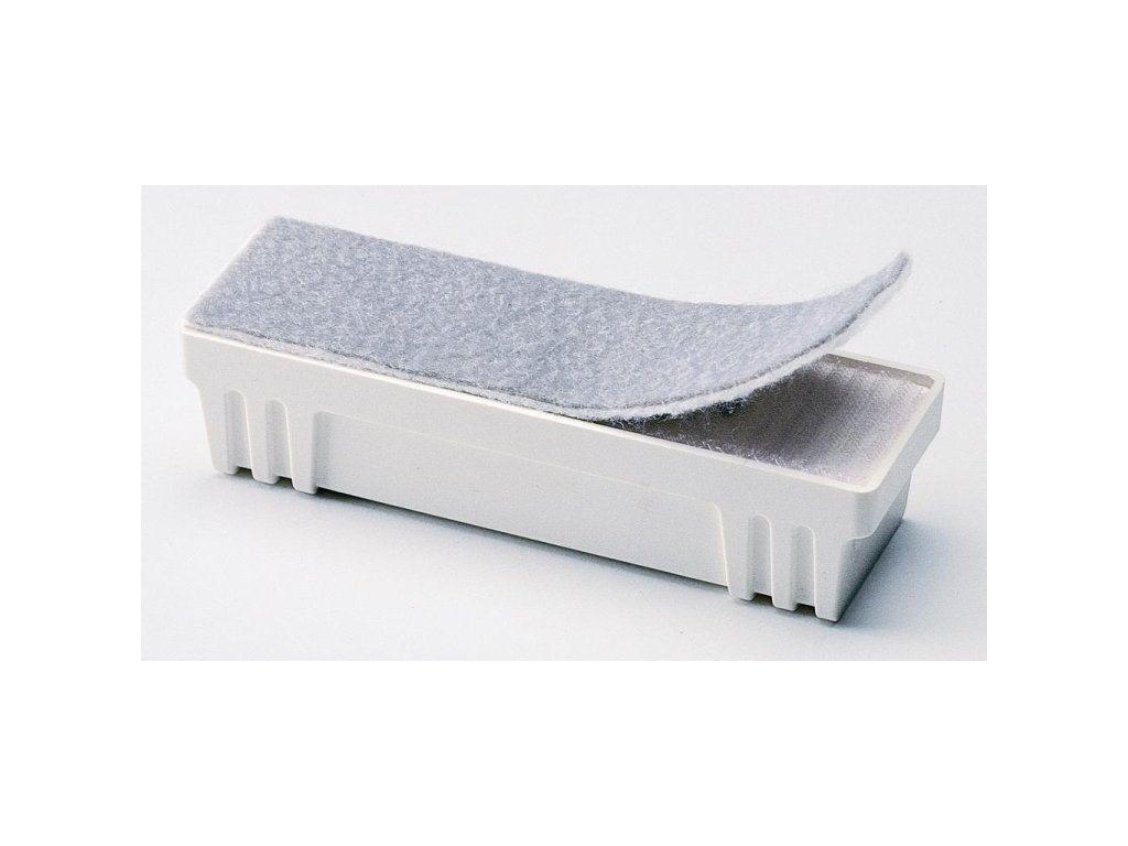 Magnetická stierka s vymieňateľnými filcovými vankúšikmi. Farba biela. Rozmery 14 × 4,5 cm.