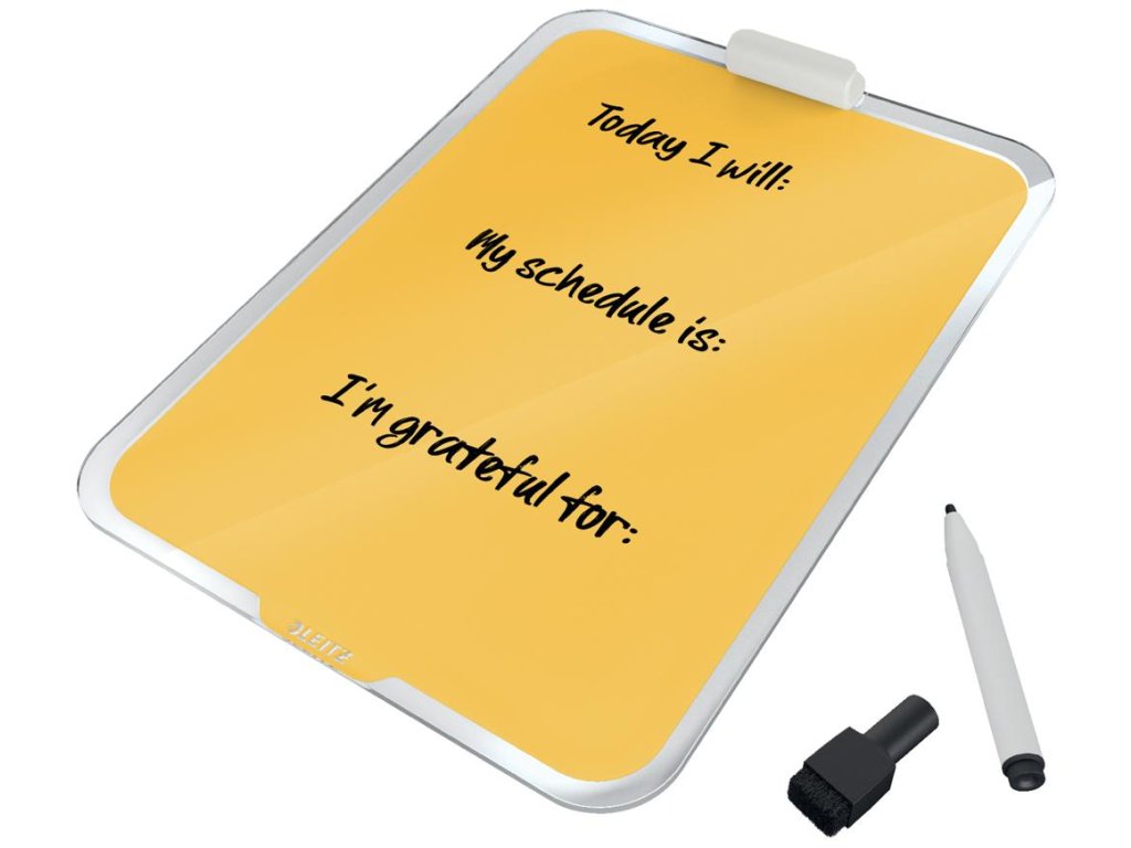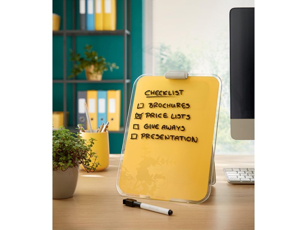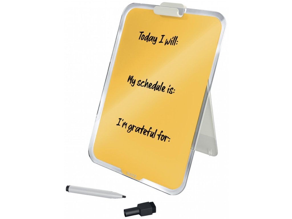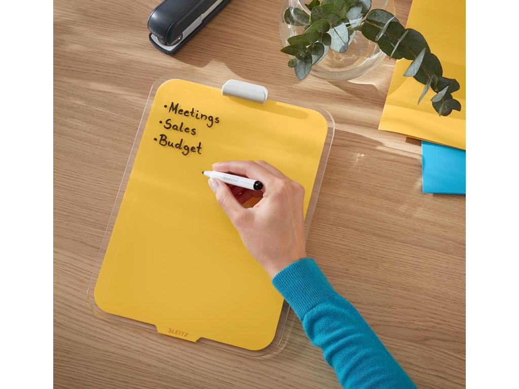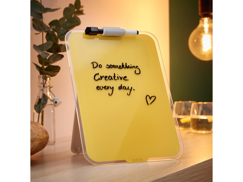 Značková kolekcia Leitz Cosy vám umožní cítiť sa ako doma, nech už vás váš pracovný deň zavedie kamkoľvek. Vďaka minimalistickému dizajnu a príjemným farbám môžete svojmu pracovnému priestoru pridať štýl a farbu. Stolný sklenený flipchart Leitz Cosy je unikátny nástroj na opakované písanie poznámok, suchým popisovačom jednoducho napíšete dôležité informácie, kedykoľvek ho utriete a môžete písať znova. Táto prémiová magnetická sklenená tabuľa je perfektným doplnkom vášho domova alebo kancelárie. Pamätá si za vás, pomôže vám pracovať efektívne celý deň. Rozmery 216 x 30 x 297. Farba žltá.