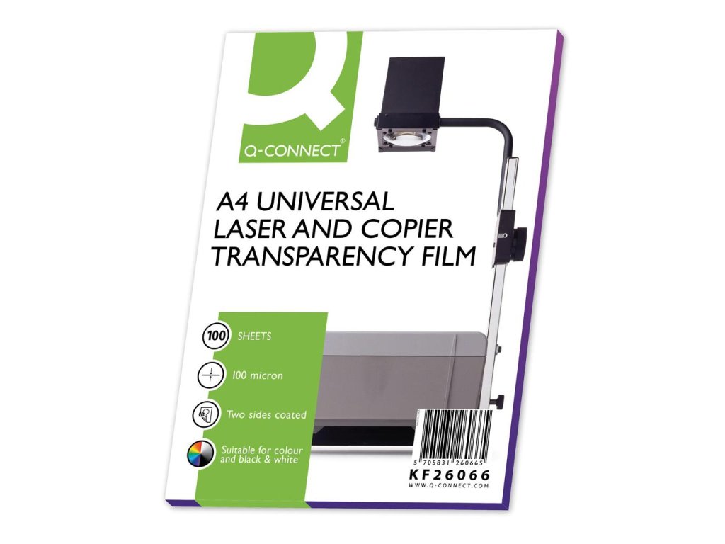 Priehľadné polyesterové fólie na spätnú projekciu. Formát A4. Vhodné pre použitie v čiernobielych a farebných kopírkach a laserových tlačiarňach, na obojstranné použitie. Bez podkladového papiera. Hrúbka 100 µm. Balenie 100 kusov.