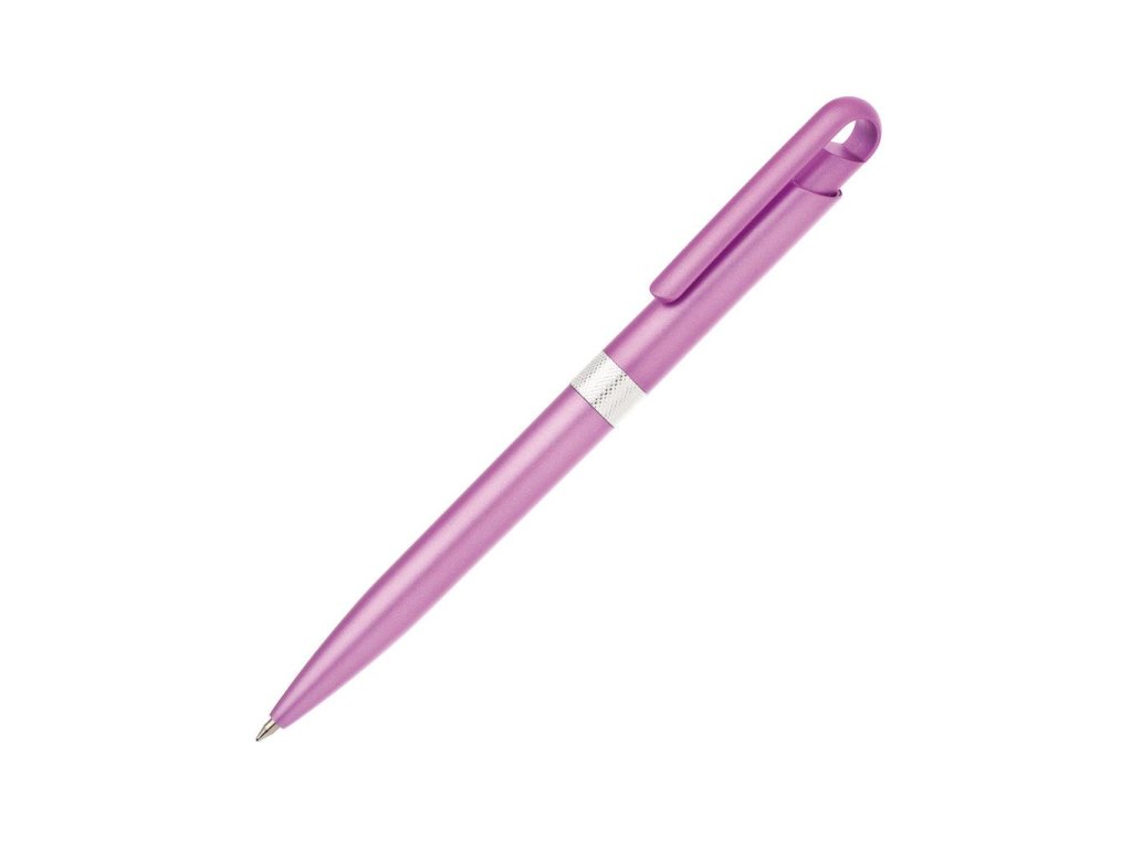 Plastové guľôčkové pero FIROL v metalických farbách. Uprostred pera je stieborný krúžok. Modrá náplň veľkoobjemová. Kolekcia DESIGN. Farba ružová.
