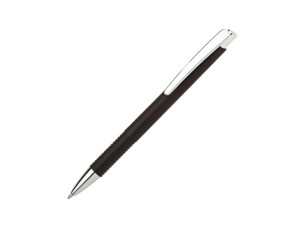 Guľôčkové pero plastové LASTI s vrúbkovaným úchopom a doplnkami v striebornej farbe. Modrá náplň X-20. Farba čierna.