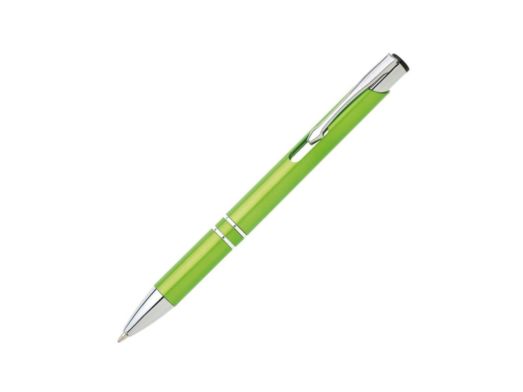 Plastové guľôčkové pero OIRA s kovovými doplnkami. Modrá náplň veľkoobjemová. Farba svetlozelená.