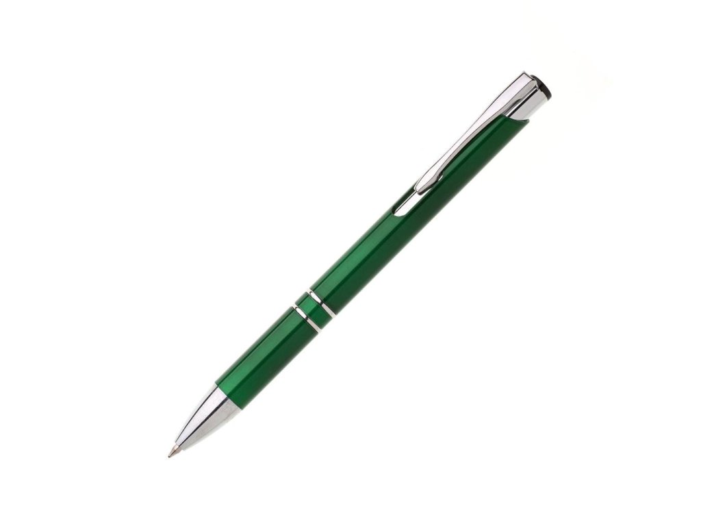 Plastové guľôčkové pero OIRA s kovovými doplnkami. Modrá náplň veľkoobjemová. Farba zelená.