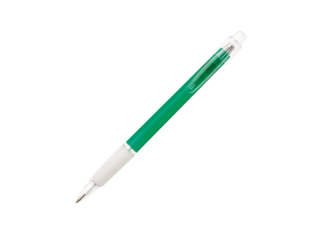 Guľôčkové pero plastové PROSTO s priehľadným farebným telom a pogumovaným úchopom . Modrá náplň X-20. Farba zelená.