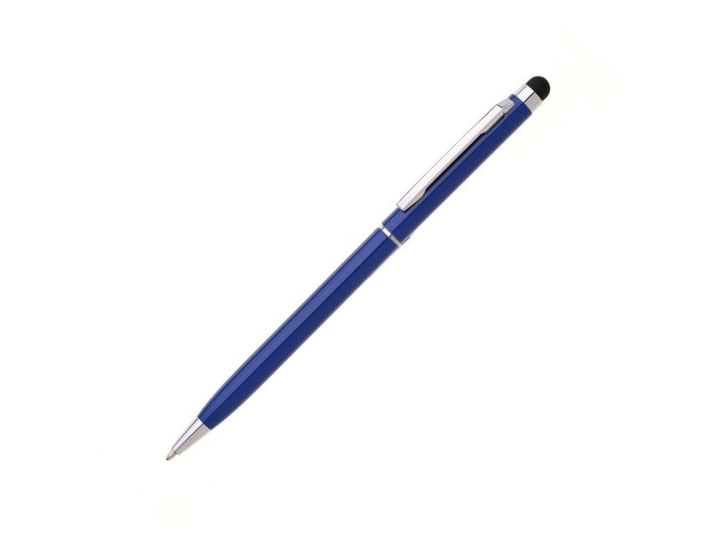 Tenké kovové guľôčkové pero s otočným mechanizmom a hrotom pre ovládanie dotykovej obrazovky. Strieborné chrómové doplnky, modrá náplň cross. Materiál hliník.