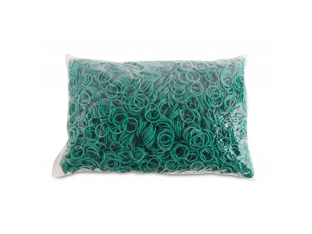 Odolné a pružné gumičky vyrobené z materiálu s prímesou gumy (60 %). Rozmery (hrúbka × šírka) 1,5 × 1,5 mm. Priemer 20 mm. Farba zelená.