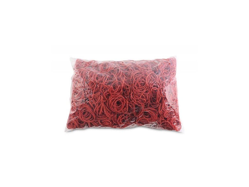 Odolné a pružné gumičky vyrobené z materiálu s prímesou gumy (60 %). Rozmery (hrúbka × šírka) 1,5 × 1,5 mm. Priemer 30 mm. Farba červená.