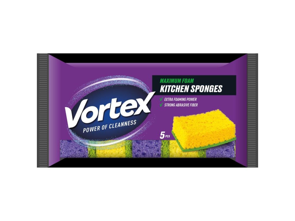 Vortex` MACROPOROUS kuchynské špongie, na jednej strane makropórovitá pena a na druhej silné čistiace abrazívne talianske vlákna, ktoré ľahko odstránia nečistotu z riadov. Vytvárajú veľké množstvo jemnej peny, 5 ks.