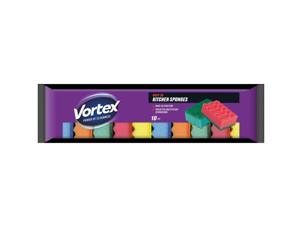 Vortex` štandardné kuchynské špongie - vlnité. Špeciálne abrazívne vlákno odstraňuje všetky druhy nečistôt. Majú jedinečný zvlnený povrch, ktorý poskytuje intenzívne čistiace vlastnosti a lepšiu penivosť, 10 ks.
