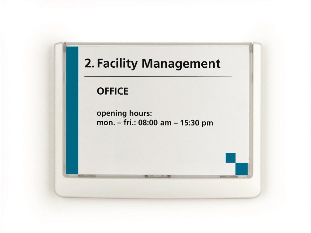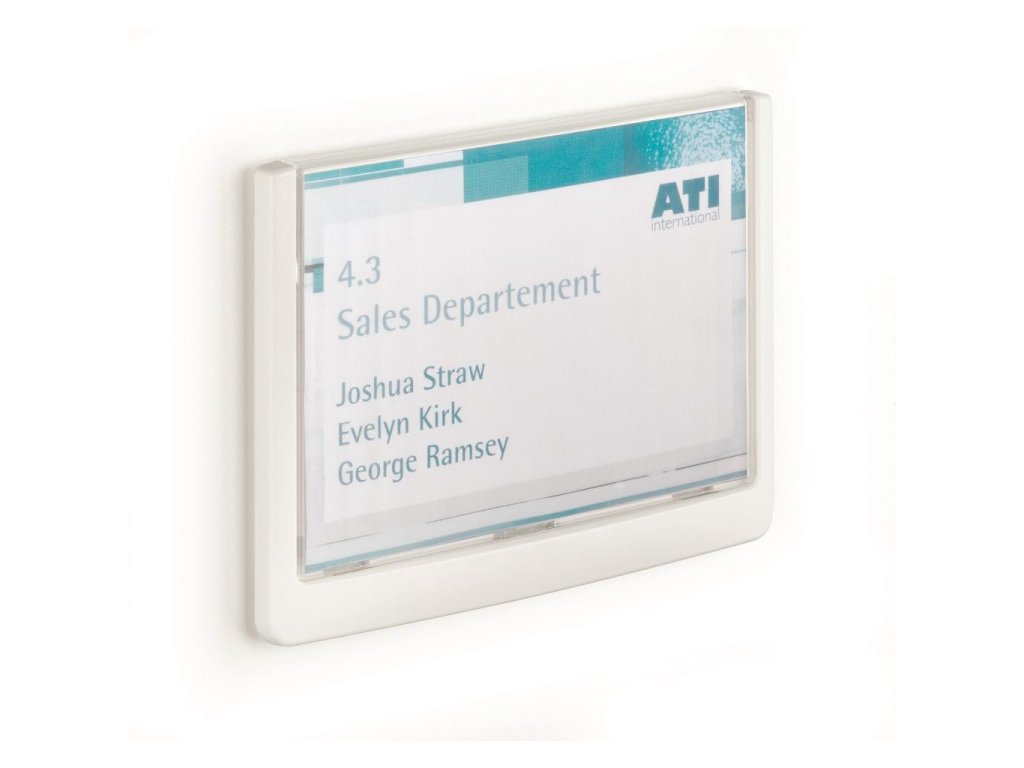 Moderná informačná tabuľka na dvere s lemom v atraktívnej bielej farbe. Predný panel sa otvára na jedno zatlačenie, a tým sa jednoducho sprístupnia vložené popisné papiere, ktoré sa môžu vymieňať podľa potrieb. Tabuľka je ideálna do kancelárií, úradov, škôl, univerzít a hotelov. Súčasťou balenia je montážna sada s názorným návodom. Namiesto pevného montovania môže byť tabuľka k povrchu aj prilepená.
