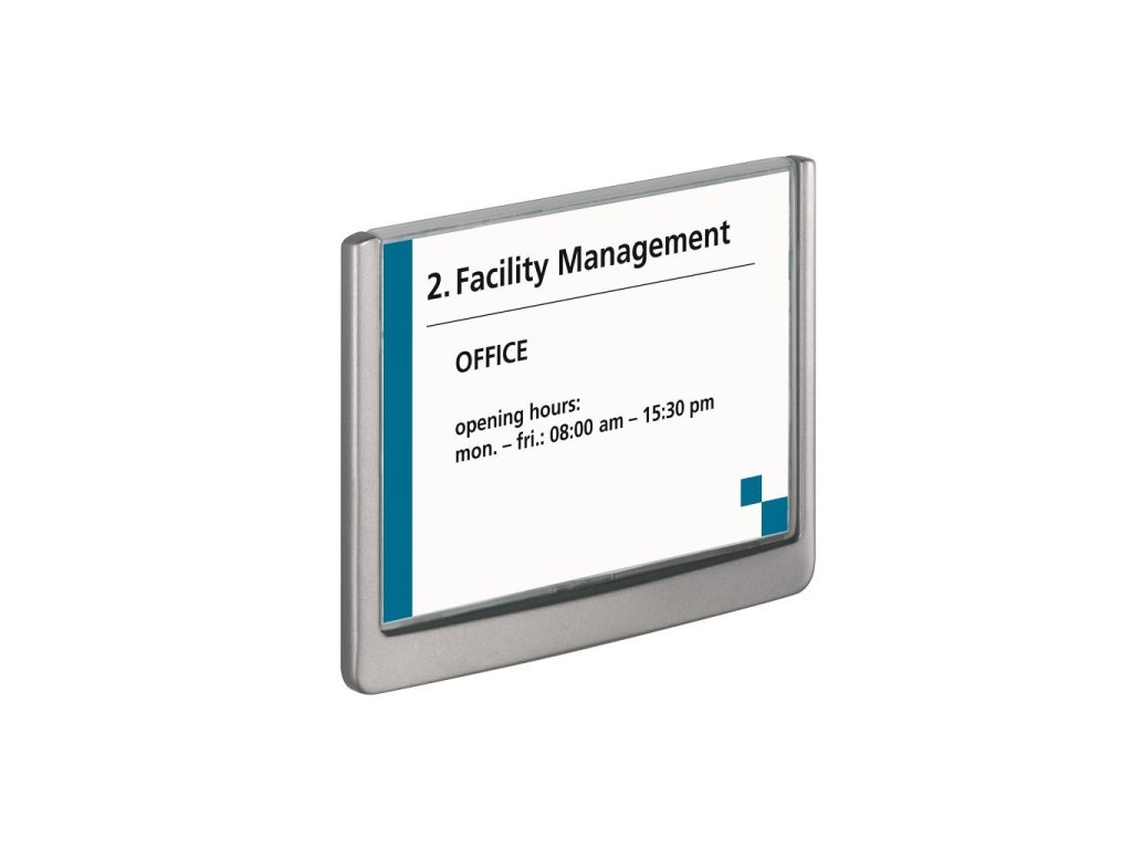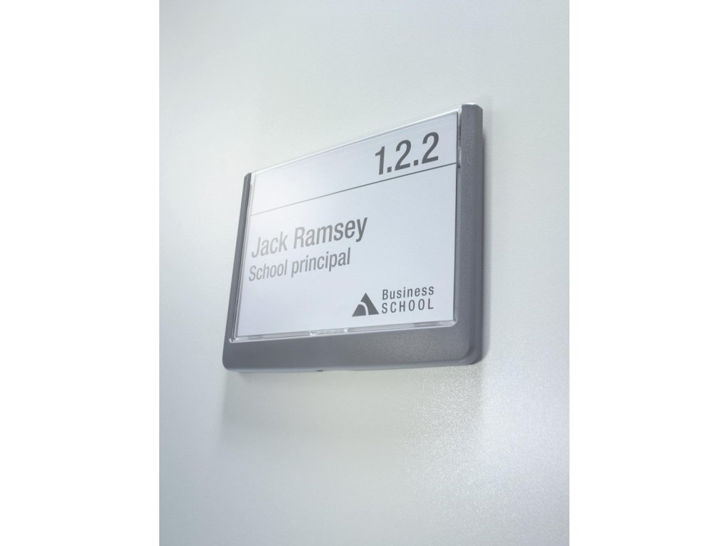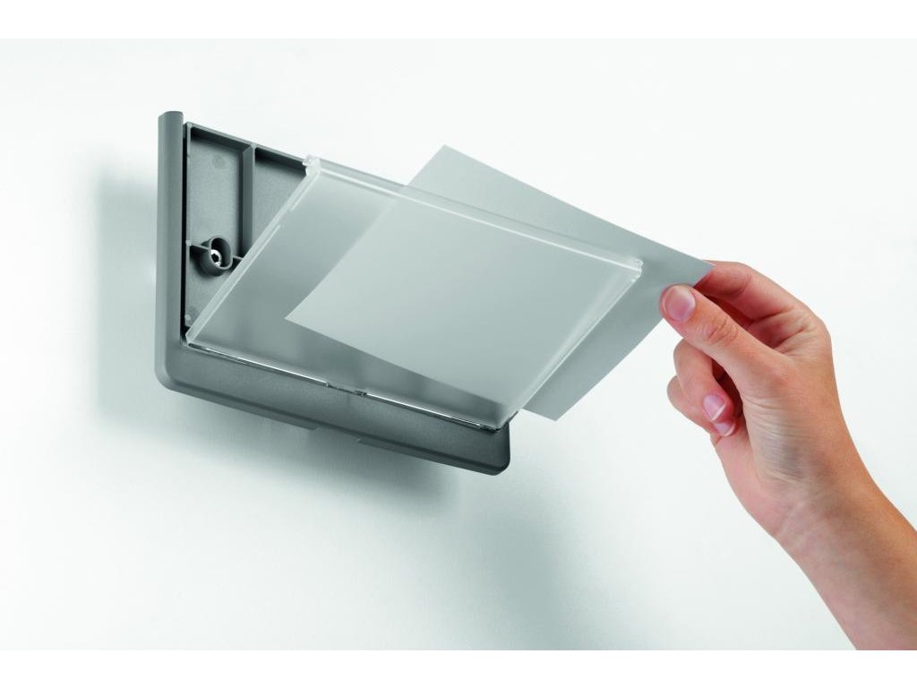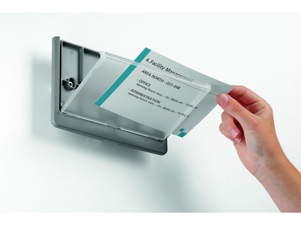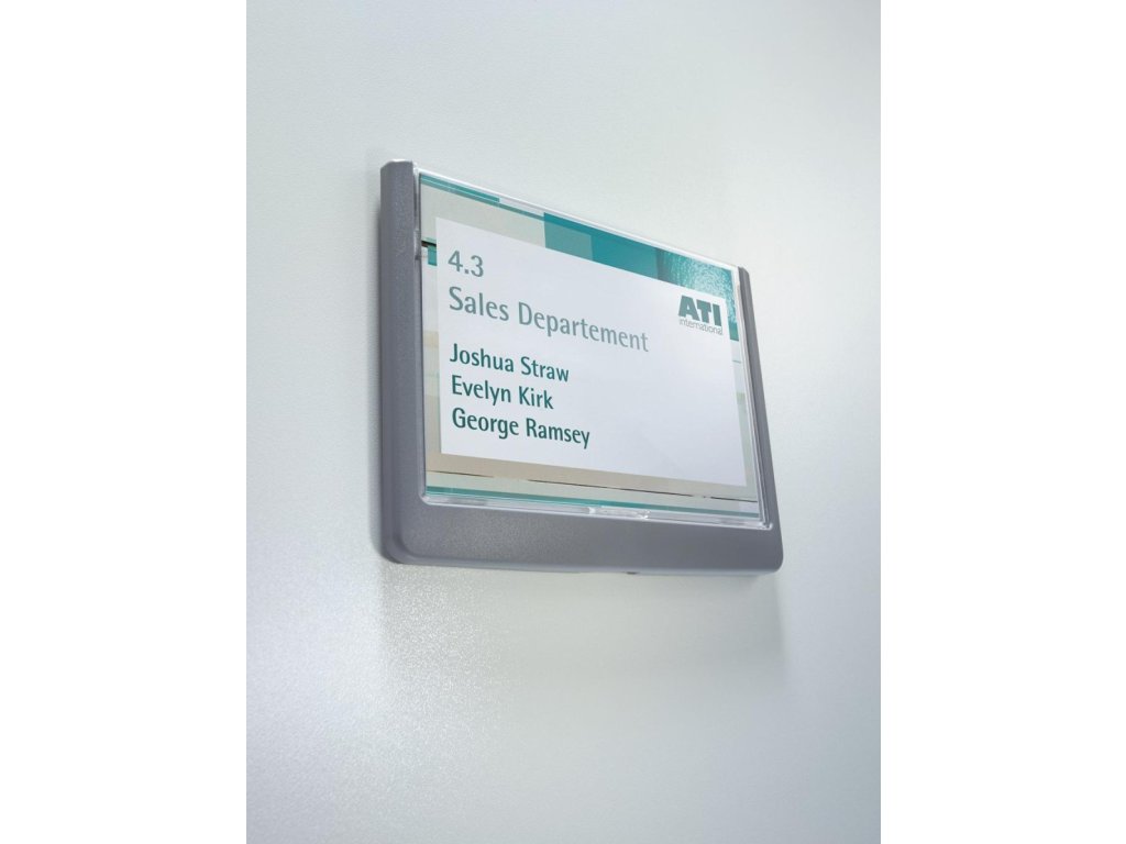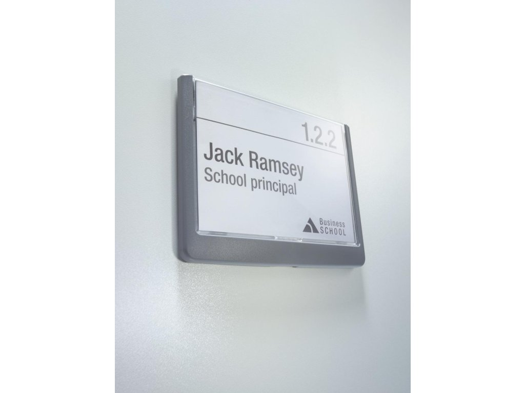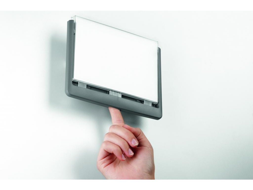 Moderná informačná tabuľka na dvere s lemom v atraktívnej grafitovej farbe. Predný panel sa otvára na jedno zatlačenie, a tým sa jednoducho sprístupnia vložené popisné papiere, ktoré sa môžu vymieňať podľa potrieb. Tabuľka je ideálna do kancelárií, úradov, škôl, univerzít a hotelov. Súčasťou balenia je montážna sada s názorným návodom. Namiesto pevného montovania môže byť tabuľka k povrchu aj prilepená.