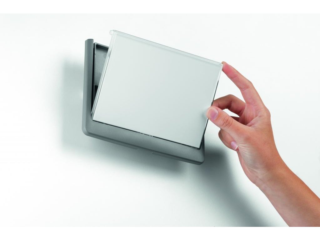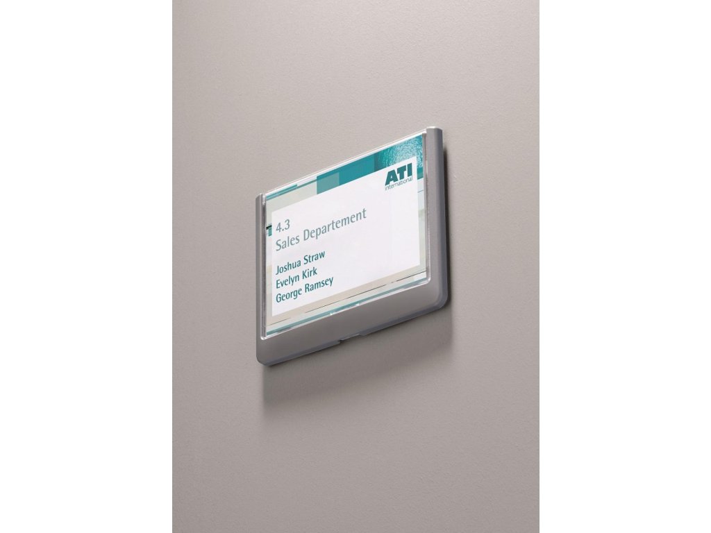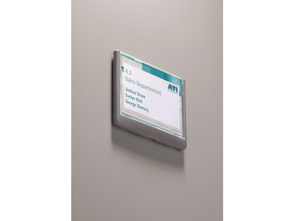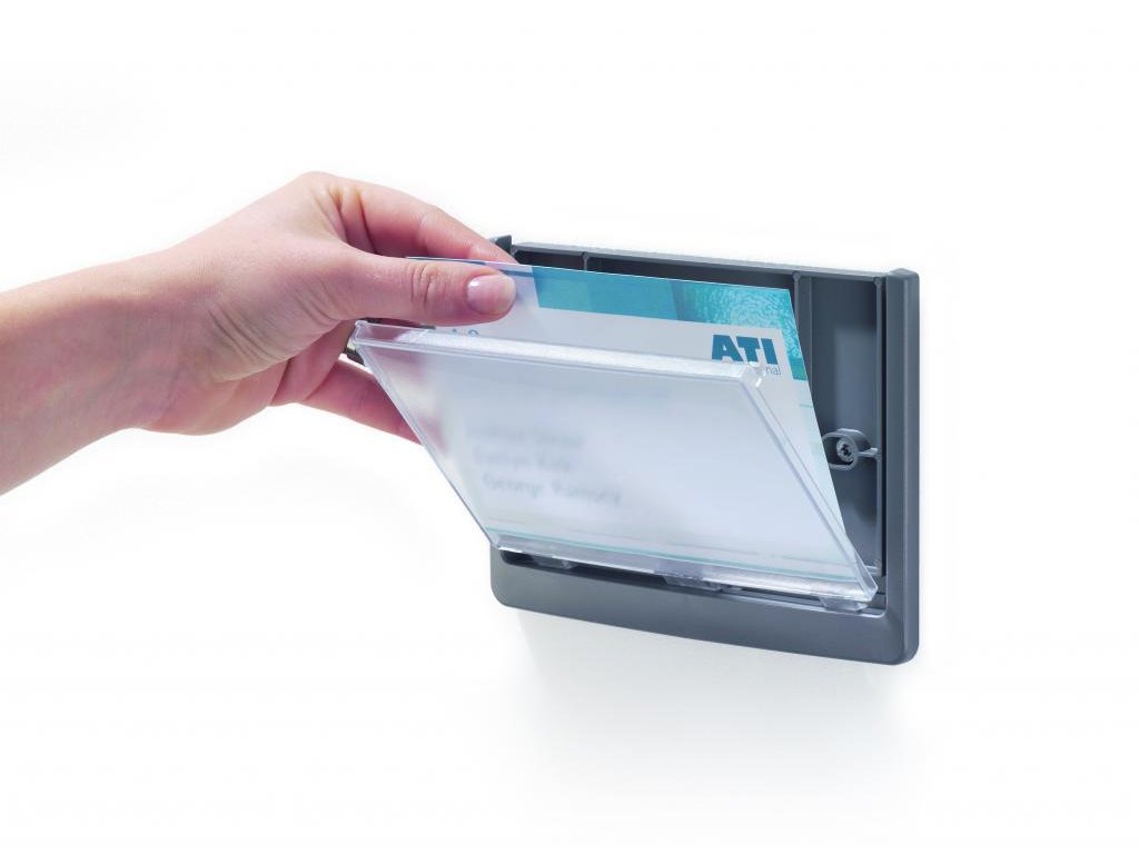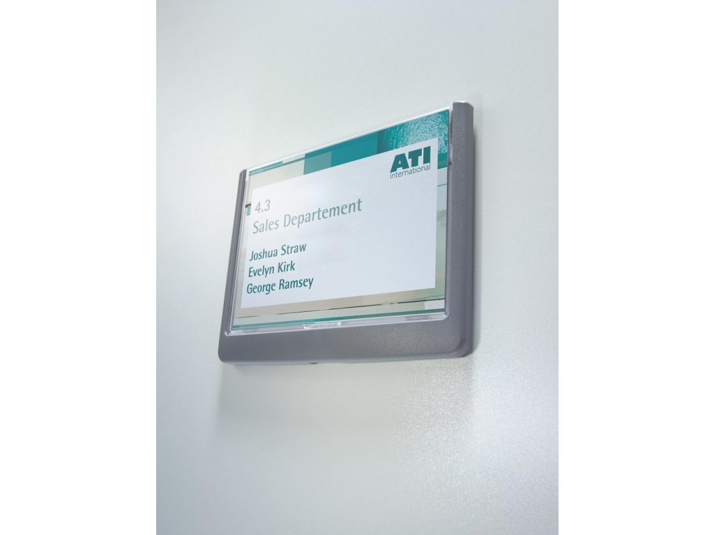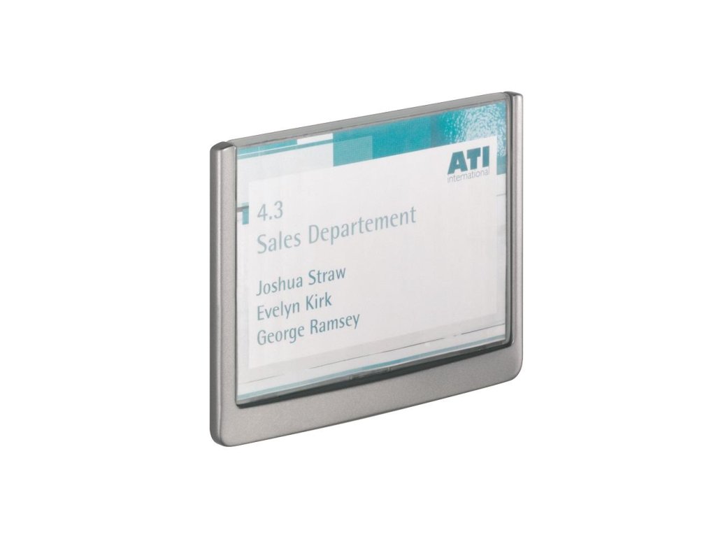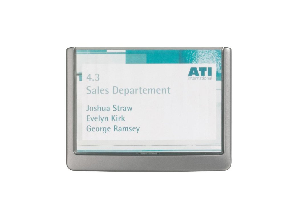 Moderná informačná tabuľka na dvere s lemom v atraktívnej grafitovej farbe. Predný panel sa otvára na jedno zatlačenie, a tým sa jednoducho sprístupnia vložené popisné papiere, ktoré sa môžu vymieňať podľa potrieb. Tabuľka je ideálna do kancelárií, úradov, škôl, univerzít a hotelov. Súčasťou balenia je montážna sada s názorným návodom. Namiesto pevného montovania môže byť tabuľka k povrchu aj prilepená.