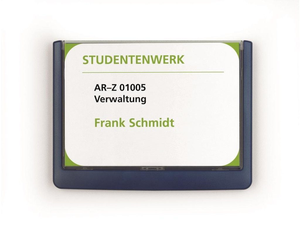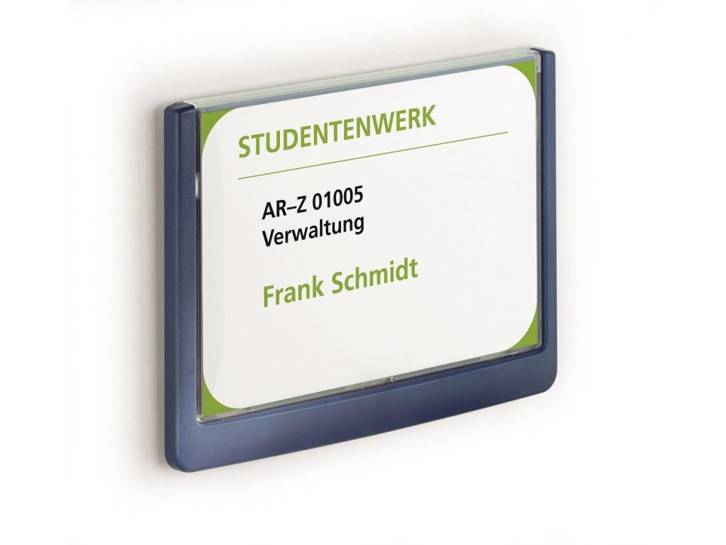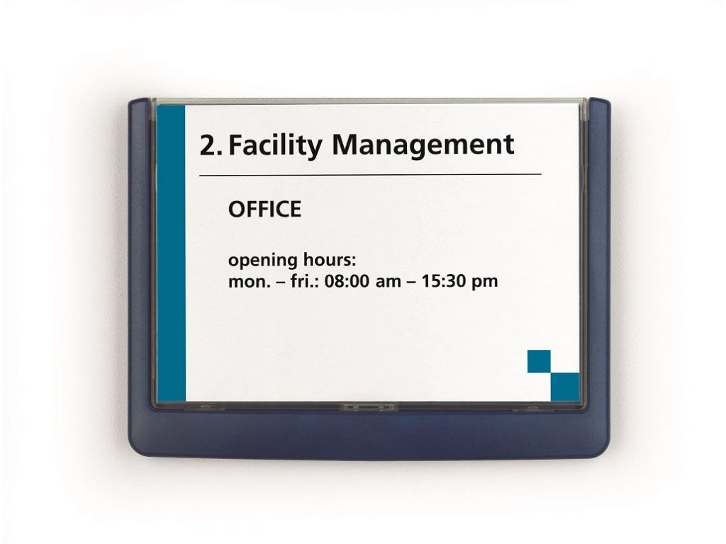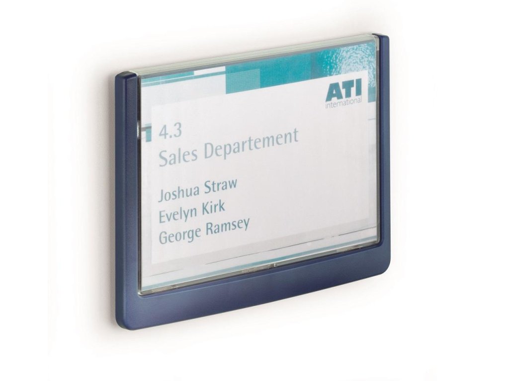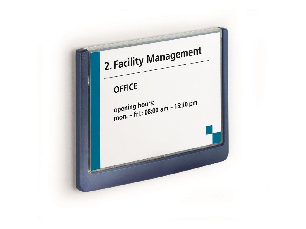 Moderná informačná tabuľka na dvere s lemom v atraktívnej modrej farbe. Predný panel sa otvára na jedno zatlačenie, a tým sa jednoducho sprístupnia vložené popisné papiere, ktoré sa môžu vymieňať podľa potrieb. Tabuľka je ideálna do kancelárií, úradov, škôl, univerzít a hotelov. Súčasťou balenia je montážna sada s názorným návodom. Namiesto pevného montovania môže byť tabuľka k povrchu aj prilepená.