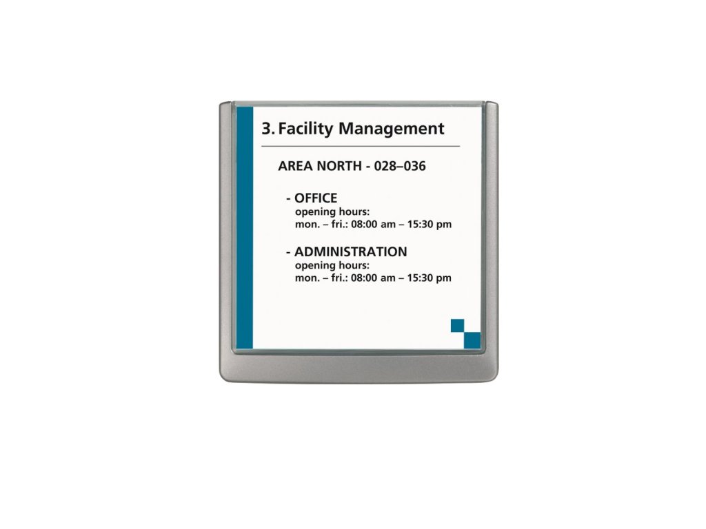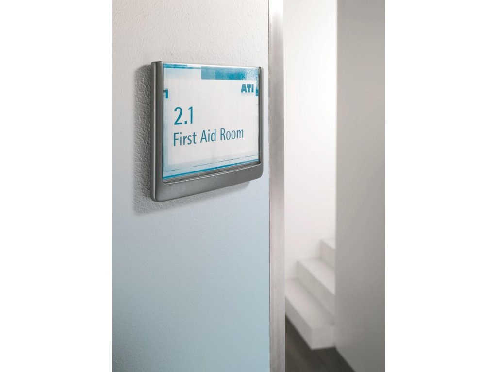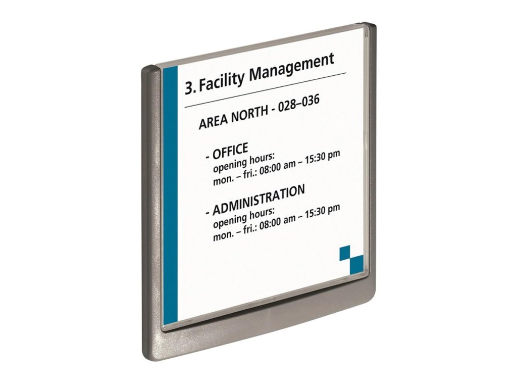 Moderná informačná tabuľka na dvere s lemom v atraktívnej grafitovej farbe. Predný panel sa otvára na jedno zatlačenie, a tým sa jednoducho sprístupnia vložené popisné papiere, ktoré sa môžu vymieňať podľa potrieb. Tabuľka je ideálna do kancelárií, úradov, škôl, univerzít a hotelov. Súčasťou balenia je montážna sada s názorným návodom. Namiesto pevného montovania môže byť tabuľka k povrchu aj prilepená.