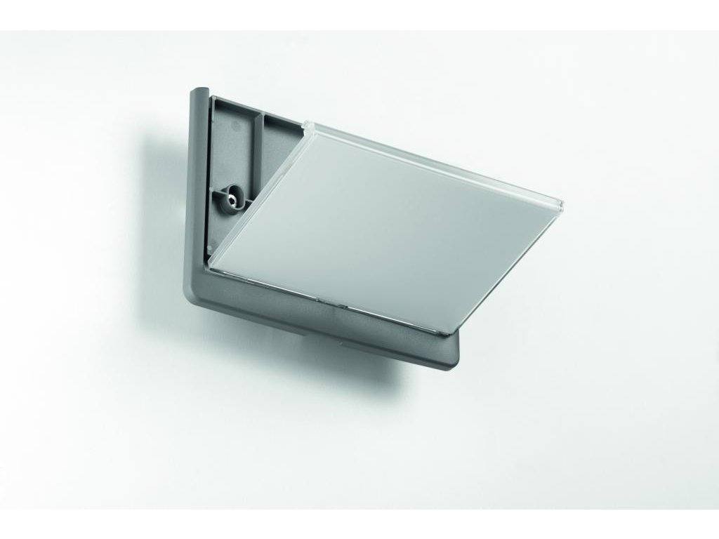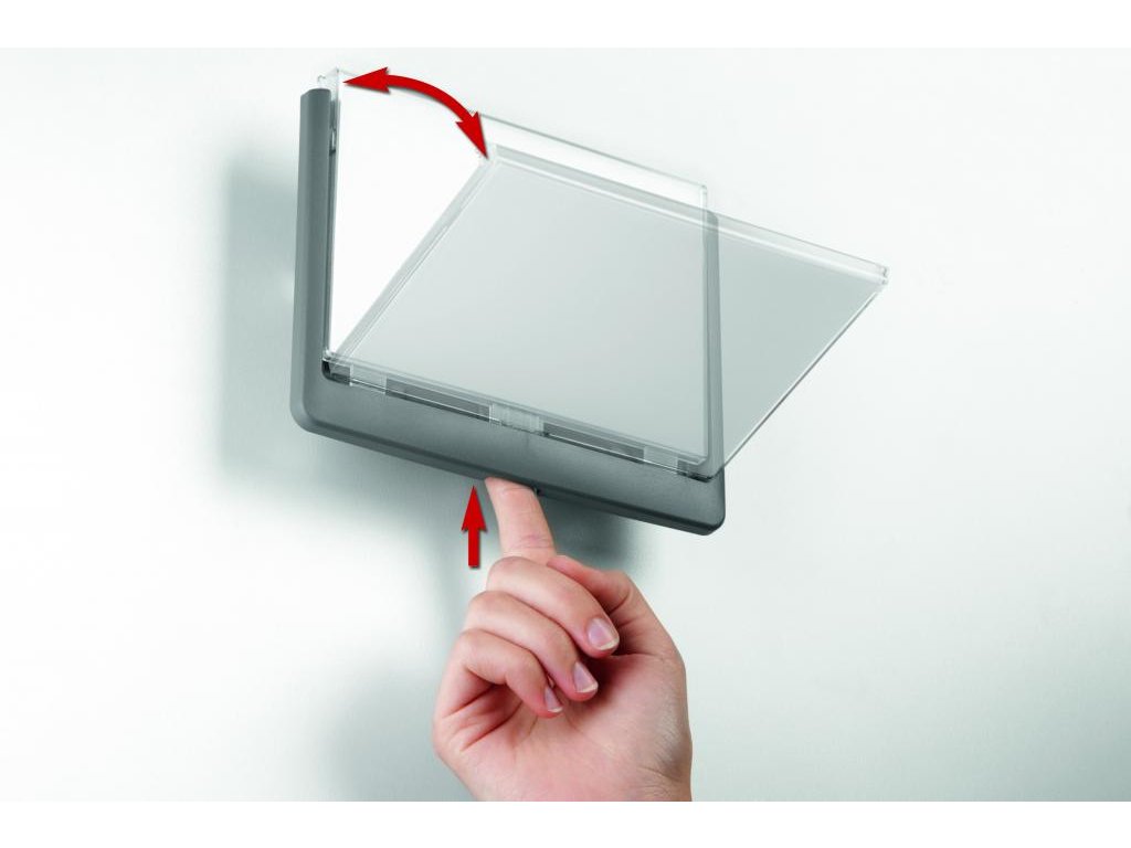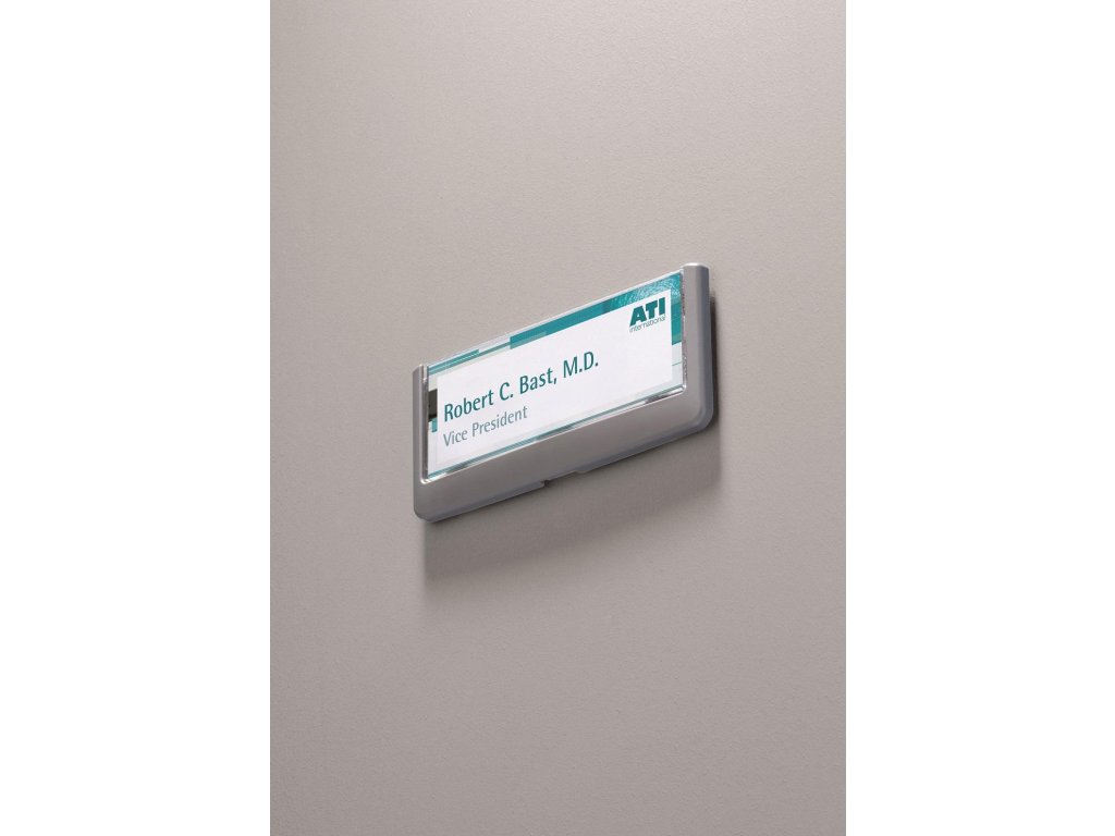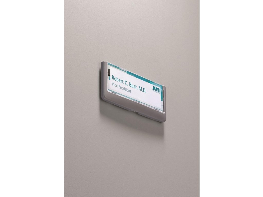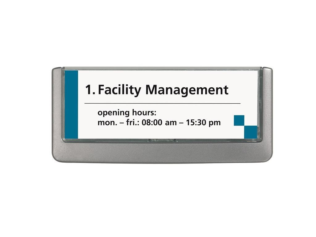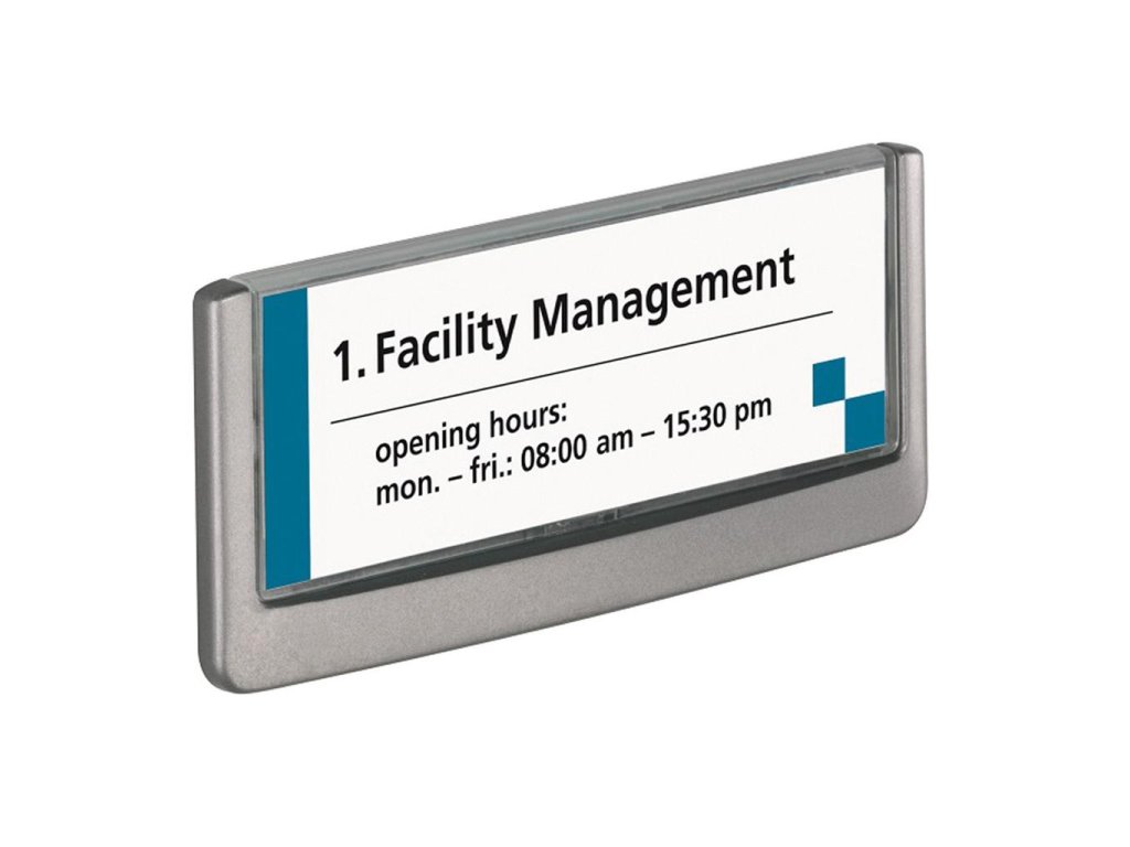 Moderná informačná tabuľka na dvere s lemom v atraktívnej grafitovej farbe. Predný panel sa otvára na jedno zatlačenie, a tým sa jednoducho sprístupnia vložené popisné papiere, ktoré sa môžu vymieňať podľa potrieb. Tabuľka je ideálna do kancelárií, úradov, škôl, univerzít a hotelov. Súčasťou balenia je montážna sada s názorným návodom. Namiesto pevného montovania môže byť tabuľka k povrchu aj prilepená.