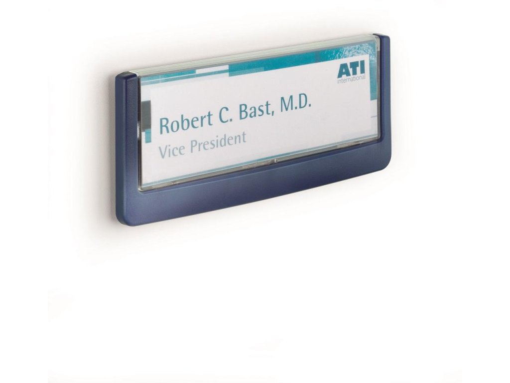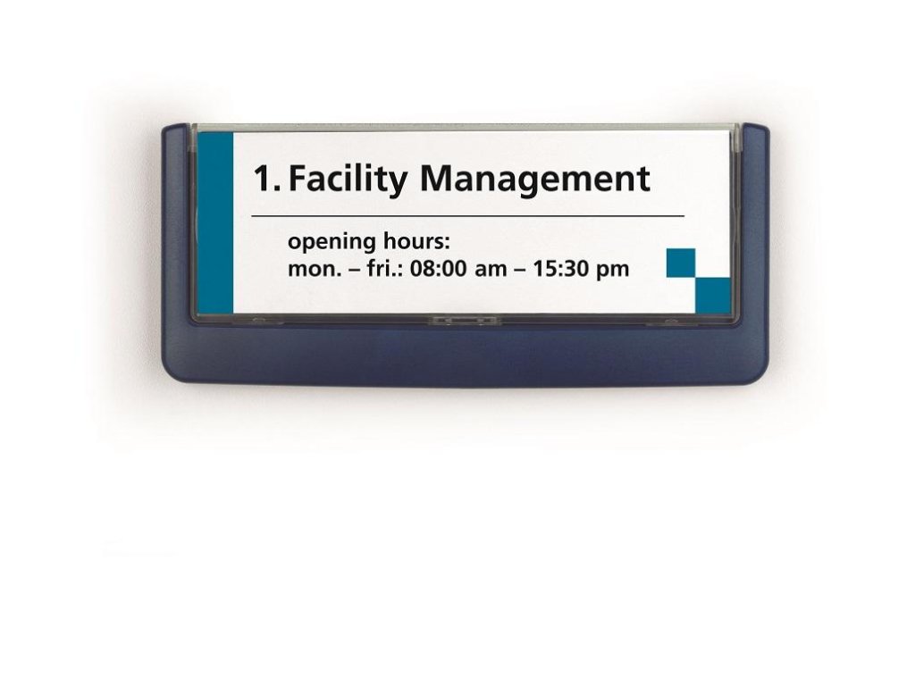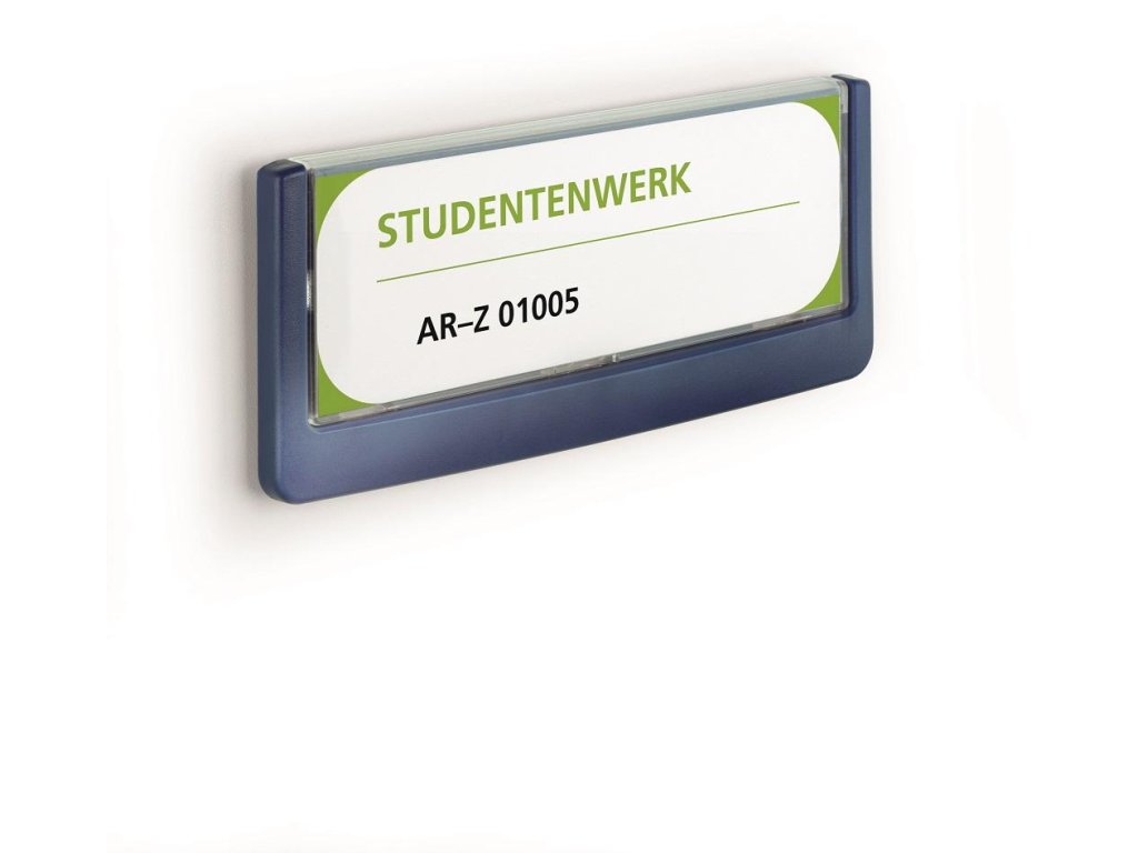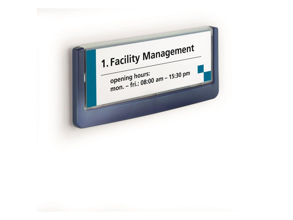 Moderná informačná tabuľka na dvere s lemom v atraktívnej modrej farbe. Predný panel sa otvára na jedno zatlačenie, a tým sa jednoducho sprístupnia vložené popisné papiere, ktoré sa môžu vymieňať podľa potrieb. Tabuľka je ideálna do kancelárií, úradov, škôl, univerzít a hotelov. Súčasťou balenia je montážna sada s názorným návodom. Namiesto pevného montovania môže byť tabuľka k povrchu aj prilepená.