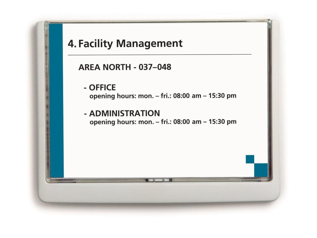 Moderná informačná tabuľka na dvere s lemom v atraktívnej bielej farbe. Predný panel sa otvára na jedno zatlačenie, a tým sa jednoducho sprístupnia vložené popisné papiere, ktoré sa môžu vymieňať podľa potrieb. Tabuľka je ideálna do kancelárií, úradov, škôl, univerzít a hotelov. Súčasťou balenia je montážna sada s názorným návodom. Namiesto pevného montovania môže byť tabuľka k povrchu aj prilepená.