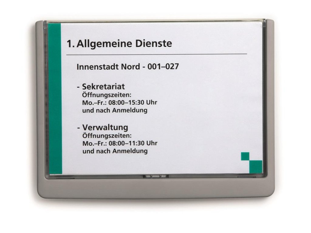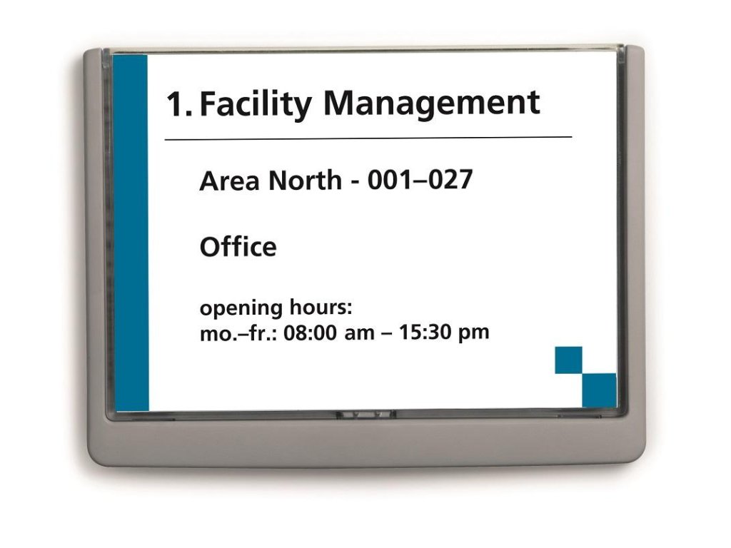 Moderná informačná tabuľka na dvere s lemom v atraktívnej grafitovej farbe. Predný panel sa otvára na jedno zatlačenie, a tým sa jednoducho sprístupnia vložené popisné papiere, ktoré sa môžu vymieňať podľa potrieb. Tabuľka je ideálna do kancelárií, úradov, škôl, univerzít a hotelov. Súčasťou balenia je montážna sada s názorným návodom. Namiesto pevného montovania môže byť tabuľka k povrchu aj prilepená.