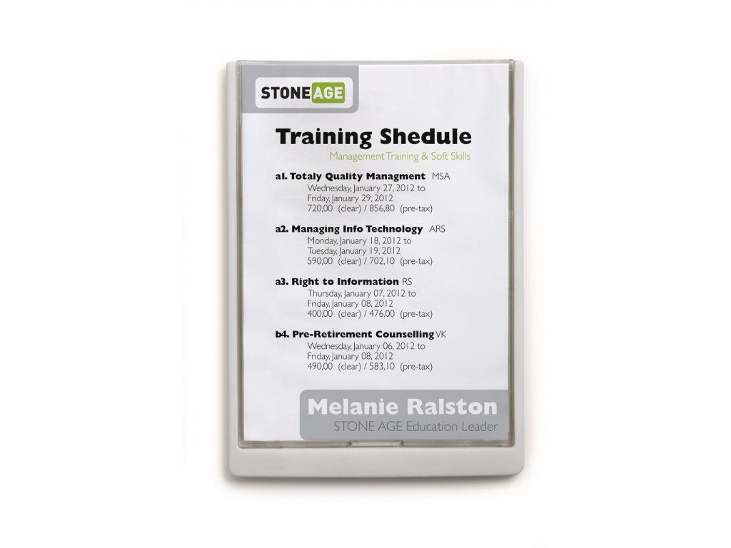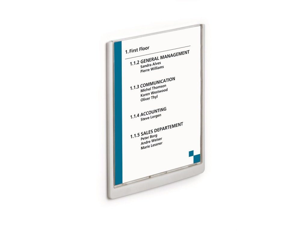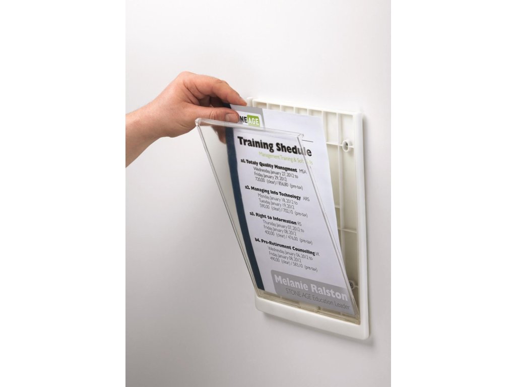 Moderná informačná tabuľka na dvere s lemom v atraktívnej bielej farbe. Predný panel sa otvára na jedno zatlačenie, a tým sa jednoducho sprístupnia vložené popisné papiere, ktoré sa môžu vymieňať podľa potrieb. Tabuľka je ideálna do kancelárií, úradov, škôl, univerzít a hotelov. Súčasťou balenia je montážna sada s názorným návodom. Namiesto pevného montovania môže byť tabuľka k povrchu aj prilepená.