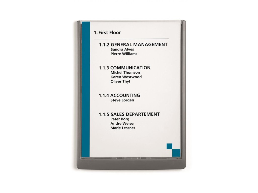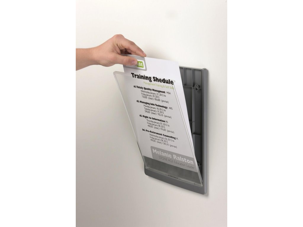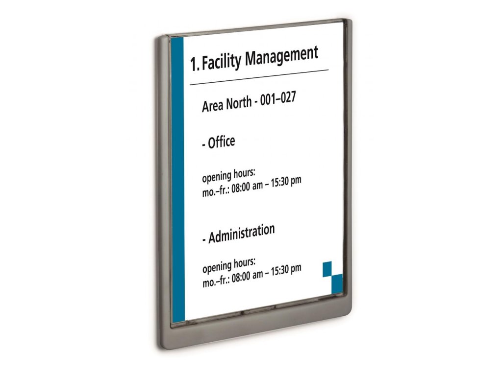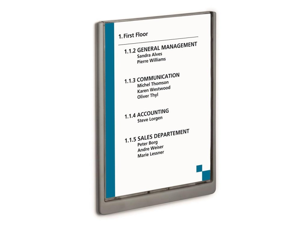 Moderná informačná tabuľka na dvere s lemom v atraktívnej grafitovej farbe. Predný panel sa otvára na jedno zatlačenie, a tým sa jednoducho sprístupnia vložené popisné papiere, ktoré sa môžu vymieňať podľa potrieb. Tabuľka je ideálna do kancelárií, úradov, škôl, univerzít a hotelov. Súčasťou balenia je montážna sada s názorným návodom. Namiesto pevného montovania môže byť tabuľka k povrchu aj prilepená.
