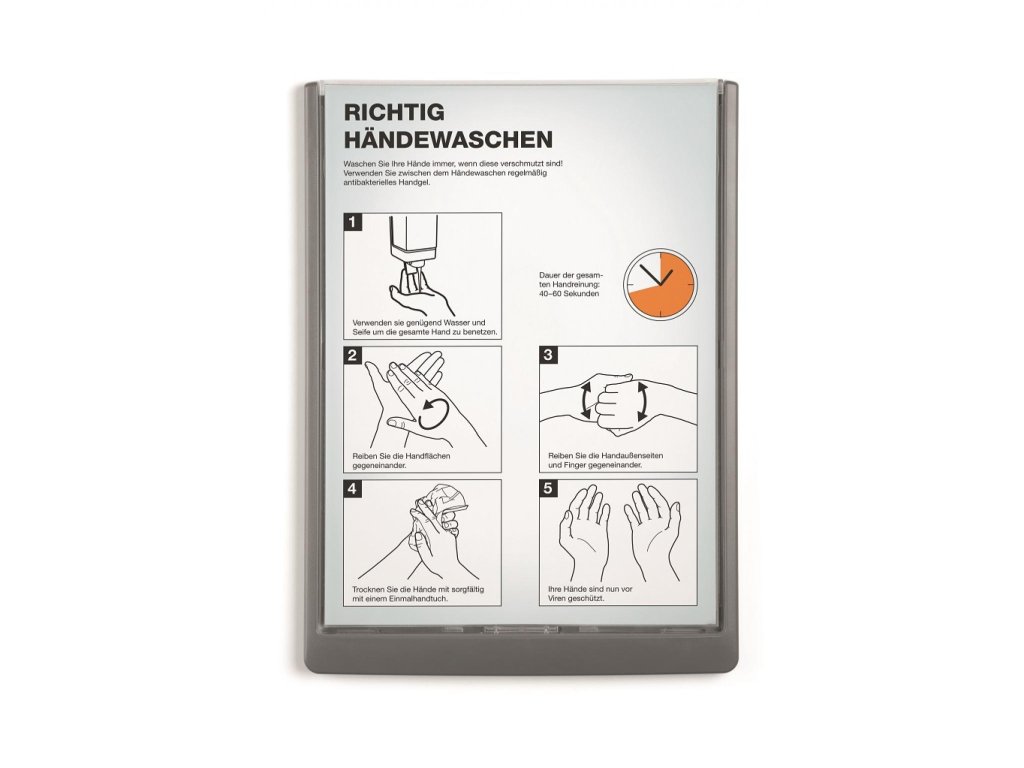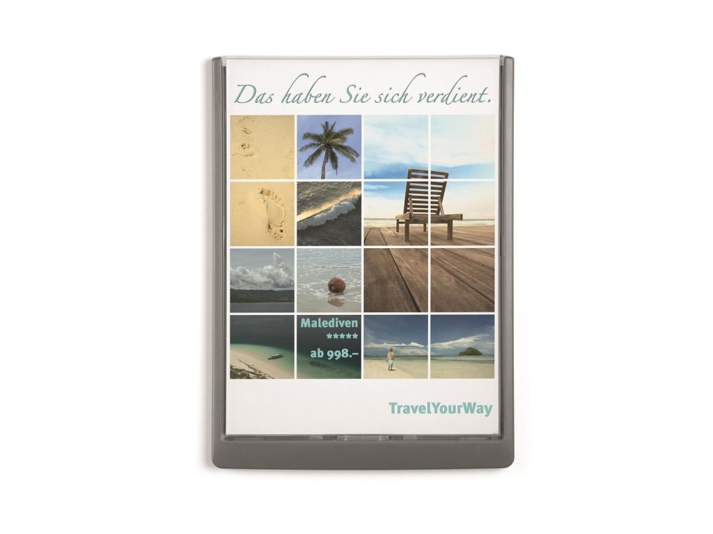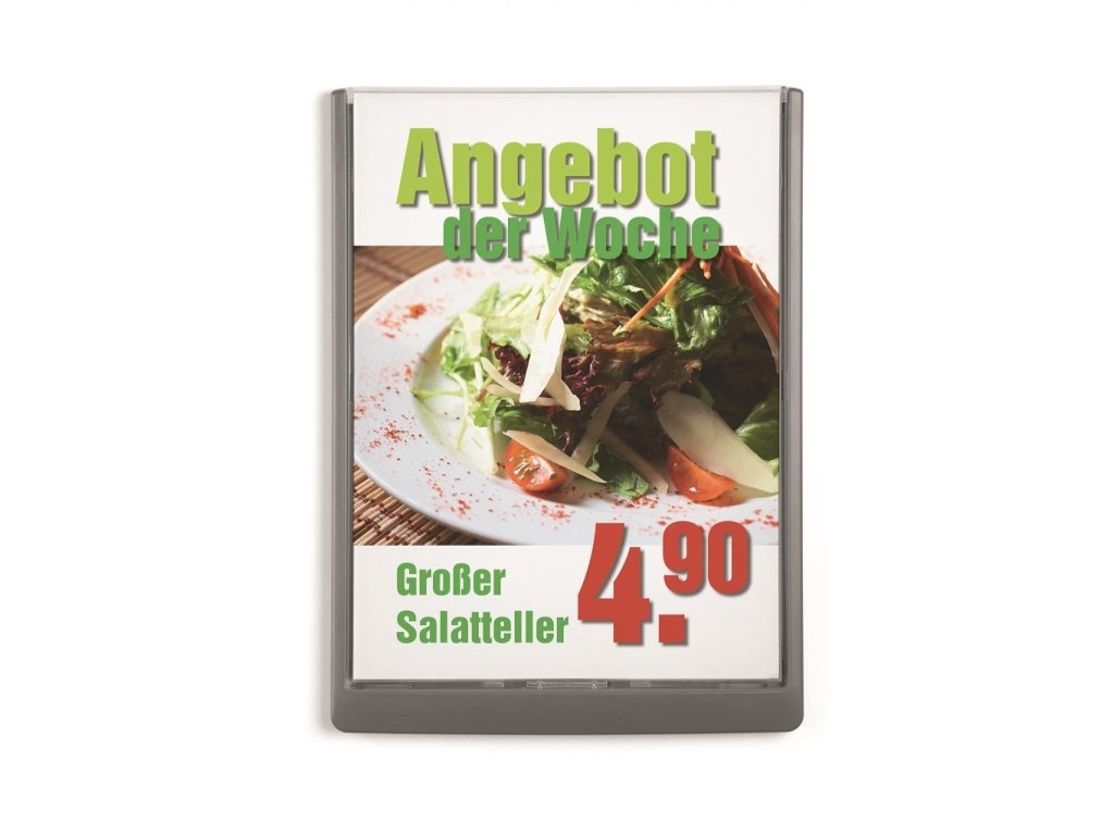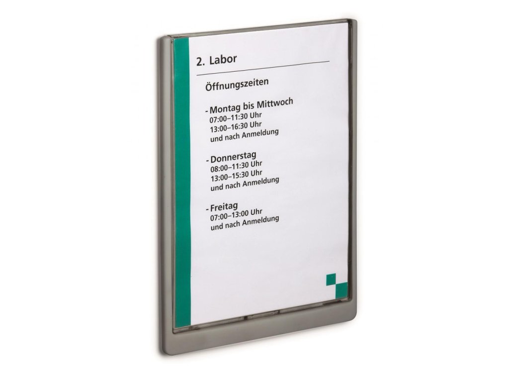 Moderná informačná tabuľka na dvere s lemom v atraktívnej grafitovej farbe. Predný panel sa otvára na jedno zatlačenie, a tým sa jednoducho sprístupnia vložené popisné papiere, ktoré sa môžu vymieňať podľa potrieb. Tabuľka je ideálna do kancelárií, úradov, škôl, univerzít a hotelov. Súčasťou balenia je montážna sada s názorným návodom. Namiesto pevného montovania môže byť tabuľka k povrchu aj prilepená.