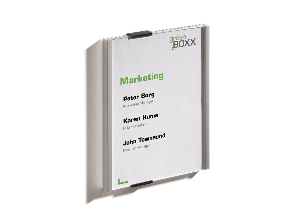 Informačná tabuľka na dvere. Štylizovaná tabuľka vo vrúbkovanej úprave, spodná časť z vysoko kvalitného hliníka, fixujúce spojky v čiernej farbe. K podkladu môže byť zadnou časťou priskrutkovaná alebo nalepená. Text je chránený neoslňujúcim akrylátovým krytom, ktorý pridržiavajú dve fixujúce spojky. Súčasťou balenia je montážna sada s názorným návodom a čistým listom papiera vo veľkosti tabuľky.