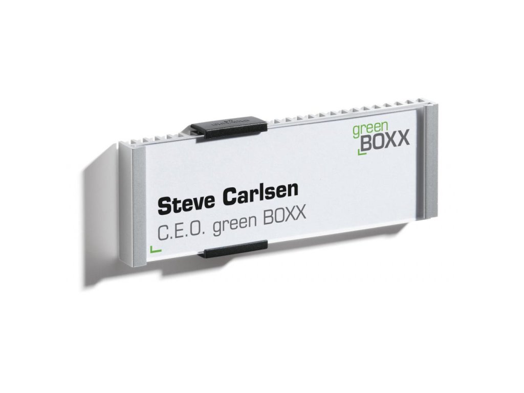 Informačná tabuľka na dvere. Štylizovaná tabuľka vo vrúbkovanej úprave, spodná časť z vysoko kvalitného hliníka, fixujúce spojky v čiernej farbe. K podkladu môže byť zadnou časťou priskrutkovaná alebo nalepená. Text je chránený neoslňujúcim akrylátovým krytom, ktorý pridržiavajú dve fixujúce spojky. Súčasťou balenia je montážna sada s názorným návodom a čistým listom papiera vo veľkosti tabuľky.