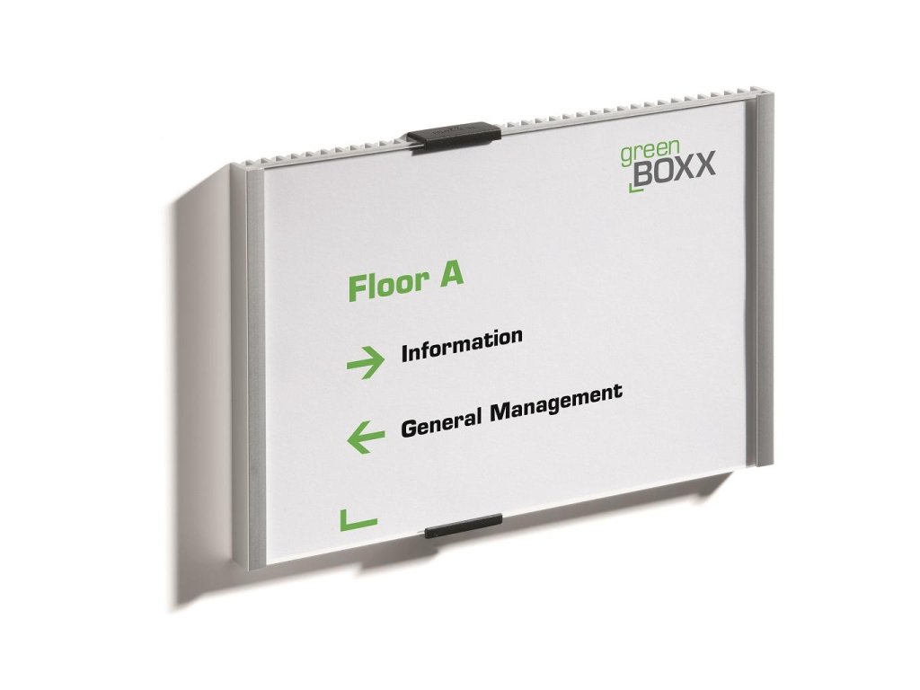 Informačná tabuľka na dvere. Štylizovaná tabuľka vo vrúbkovanej úprave, spodná časť z vysoko kvalitného hliníka, fixujúce spojky v čiernej farbe. K podkladu môže byť zadnou časťou priskrutkovaná alebo nalepená. Text je chránený neoslňujúcim akrylátovým krytom, ktorý pridržiavajú dve fixujúce spojky. Súčasťou balenia je montážna sada s názorným návodom a čistým listom papiera vo veľkosti tabuľky.