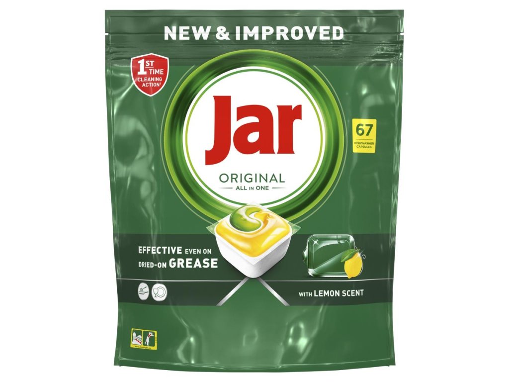 Kapsuly do umývačky riadu Jar Original All in One čistia hneď na prvýkrát, sú účinné aj pri zaschnutej mastnote a zanechajú váš riad žiarivo čistý. Jar kombinuje tekutinu a prášok do jednej silnej kapsuly. Jej vysokorozpustné vrecúško sa rýchlo rozpustí a čistí hneď od začiatku programu. A tak ľahko sa používajú! Nemusíte ich odbaľovať, stačí vložiť do dávkovača na čistiaci prostriedok do umývačky riadu.