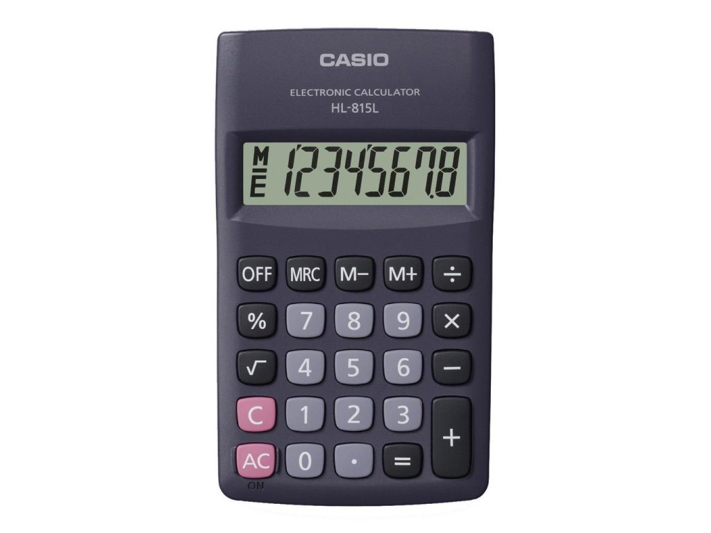 Malá vrecková kalkulačka s veľkým 8-miestnym LCD displejom a tlačidlami z tvrdej gumy.